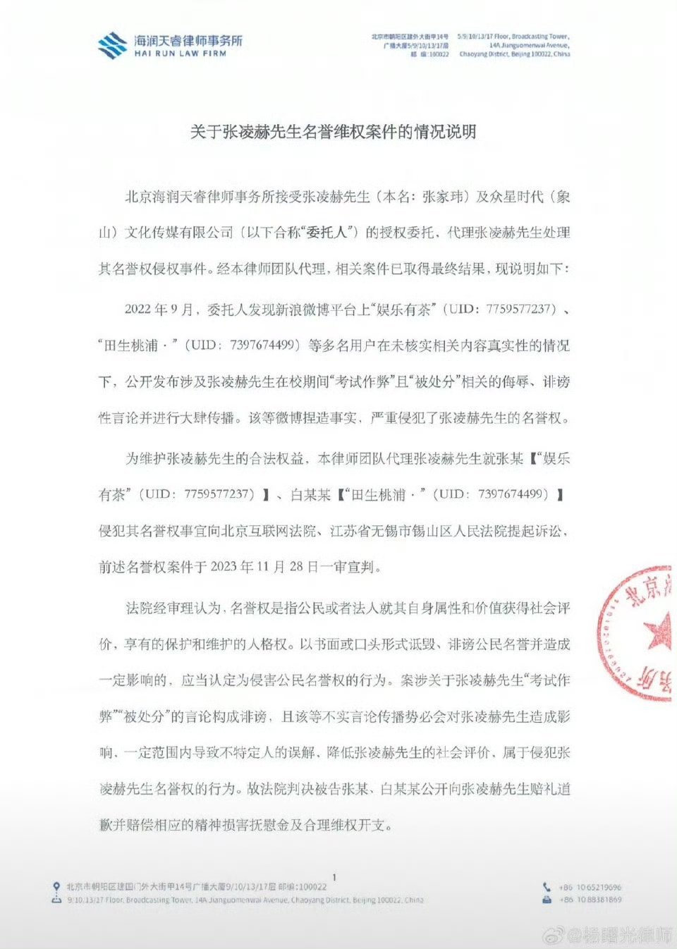 张凌赫工作室发布告嘿声明,要告全平台的不实言论和侵权用户。