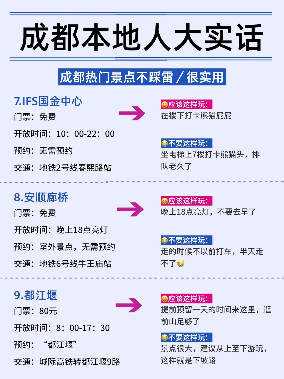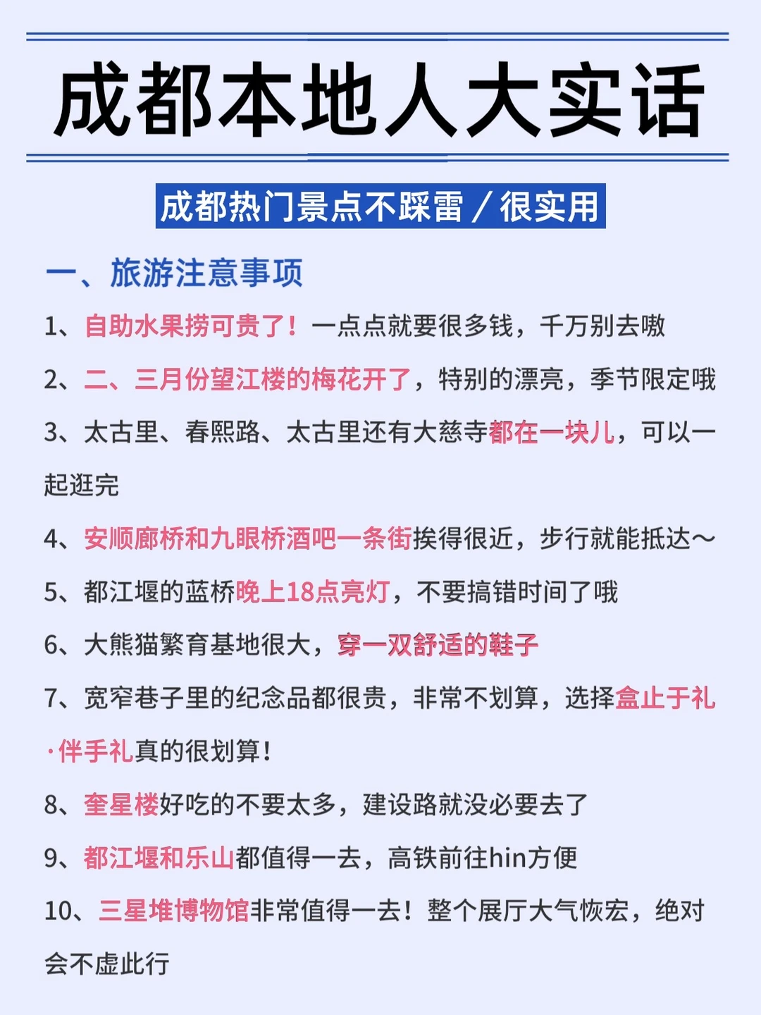 请大数据务必把这篇攻略推荐给✅想来成都玩的姐妹!成都好吃好玩的太多了,不过雷点也多,码住这篇攻略!不交智商税❌ - 🚶行程规划 ✔️D1:成都博物馆~国金中心~春熙路~太古里~望平街~安顺廊桥 ✔️D2:大熊猫繁育基地~文殊院~望江楼公园~玉林路 ✔️D3:杜甫草堂~浣花溪公园~武侯祠~锦里 - 美食推荐 📍烤匠麻辣烤鱼(太古里店) 📍霸王虾·小龙虾江湖川菜 📍喜天秀老妈蹄花川菜馆(奎星楼店) - ✅伴手礼推荐 -