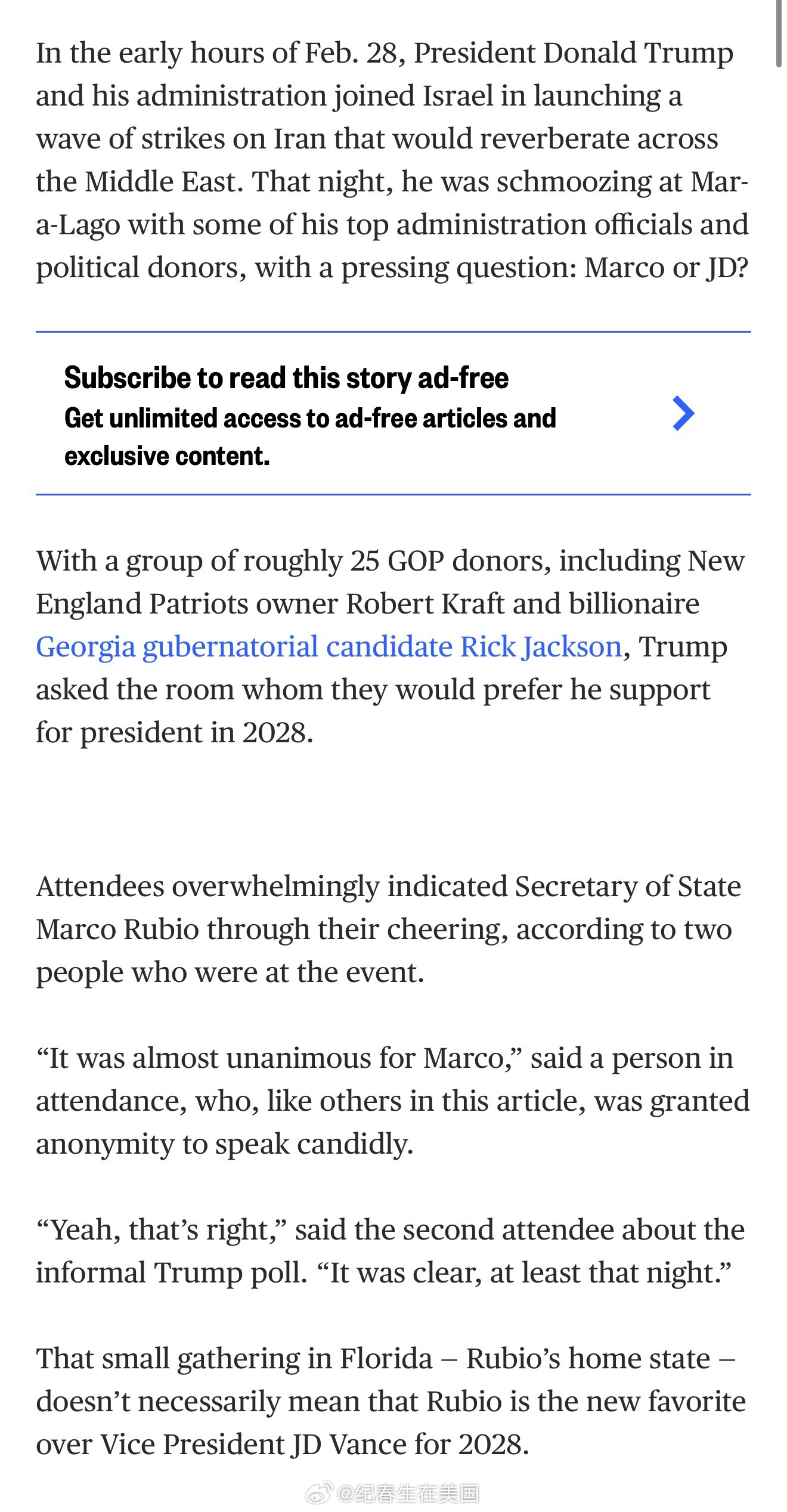 在2月28日晚海湖庄园举行的聚会上,川普随口问在场的大约25名共和党金主和盟友:如果让他们在2028年代表共和党参选总统,他们更倾向于Rubio 还是 JD Vance。