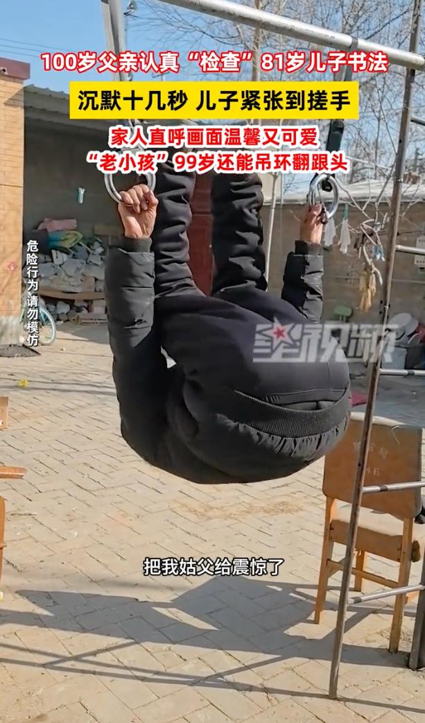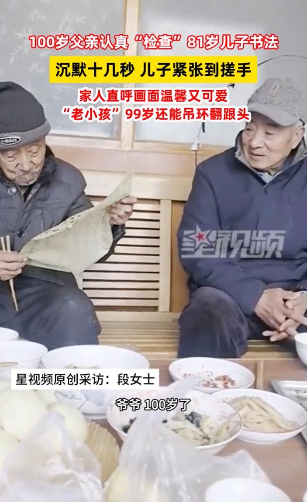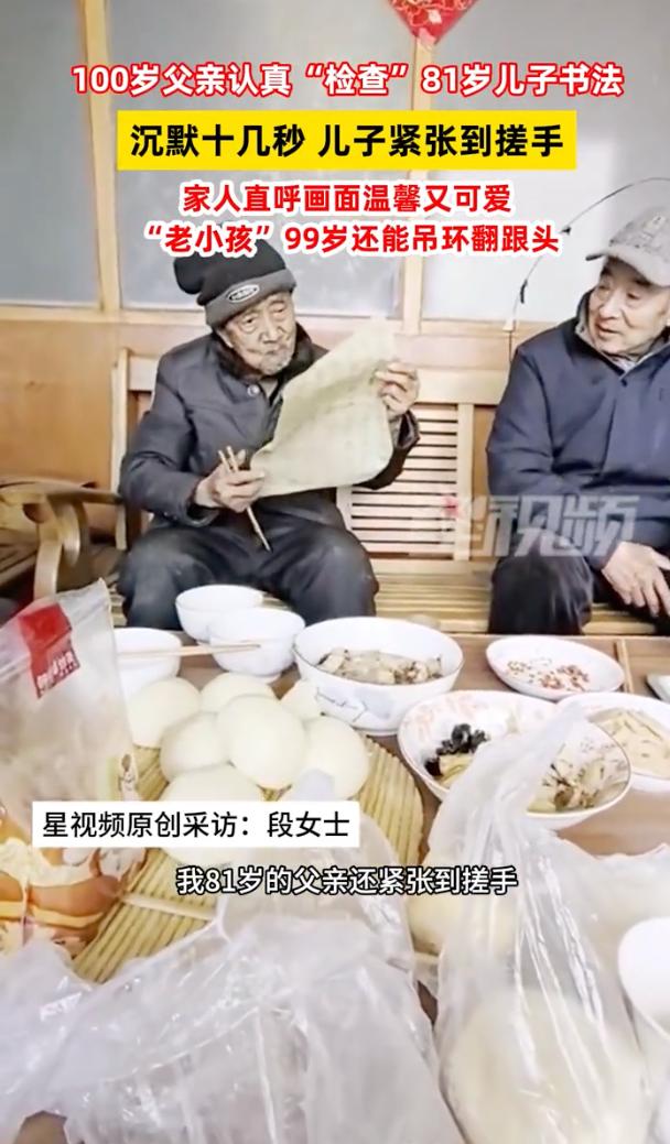 这才是最高级的“凡尔赛”!3月9日,河北保定的一户普通人家里,上演了一幕让全网瞬间泪目又忍俊不禁的画面:100岁的老父亲正襟危坐,戴着老花镜在严厉地“批改作业”,而对面那个81岁的老儿子,正局促地搓着手等待点评。网友直呼:这哪里是点评书法,这分明是活生生的“幸福实录”! 当天午后的阳光正暖,堂屋里墨香四溢。81岁的儿子刚练完一幅字,像个刚进学堂的小学生一样,恭恭敬敬地把作品递到了父亲手里。 这位百岁老爹那叫一个敬业,黑毛线帽一戴,深灰色外套一穿,鼻梁上的眼镜架得稳稳当当,甚至还拿出了放大镜。他逐字端详,从笔锋到间架结构,神情严肃得仿佛在审阅国家机密,整整十几秒一言不发,气氛一度极其“紧张”。 最戳中网友笑点和泪点的,是那位81岁的儿子。 作为一名白发苍苍的八旬长者,他在父亲面前完全卸下了“爷爷”的架子,身子微微前倾,眼神紧紧锁住老父亲的表情,两只手交握在膝盖上,不停地来回搓动、抠手指。那种期待被夸奖又怕被指正的憨厚模样,简直和咱们小时候等班主任发试卷一模一样。 正如视频拍摄者所说:“我爸在我爷爷面前,永远是个小孩。” 别看老爷子100岁了,那身体素质简直是“老神仙”级别。据家里人透露,老爷子平日里读书写字从不间断,精神世界异常丰盈,甚至在99岁高龄时,还能在院里的吊环上玩个倒立、翻个跟头,臂力和核心力量让现在的“脆皮年轻人”看后汗流浃背。这种硬朗的身子骨,正是老人家长寿的资本,也让81岁的儿子至今还能享有“承欢膝下”的顶级福气。 评论区里的网友们看完都沸腾了,有人开玩笑说:“老爷子这气场,我隔着屏幕都想把手背到后面站直了。” 也有人被这份跨越世纪的父子情整破防了,感叹道:“羡慕的不是81岁能写书法,而是81岁了还有个百岁的‘考官’爹来管着自己。” 甚至有热心网友叮嘱,老爷子玩吊环固然硬核,但下面一定要有人护着,毕竟这可是全家甚至全网的“老宝贝”。 说实话,这段视频真的把我看哭了。 这一幕最动人的地方,不在于那幅字写得好不好,而在于那份“一辈子都变不了的爱”。 你看那个81岁的儿子,那紧张搓手的样子,真不是因为“怕”,而是因为他在乎。这种在乎,是想让老父亲满意,是想告诉爸爸:“你教我的手艺,我到80岁还没丢。”这种敬畏与谦卑,是融入血脉的中国式亲情。 而那位百岁父亲,那么大年纪还认真指点,那是他在用这种方式告诉儿子:只要我在,你就有后盾;只要我在,你就永远有方向。 这种场景让我们深深地悟到一个道理:原来只要父母还在,我们就永远有地方可以安心地做回小孩。 外面的世界再复杂,在这个堂屋里,你永远是那个需要被叮嘱、被关心的孩子。这种百年的守望与陪伴,大概就是这世间最珍贵、最硬核的亲情了。