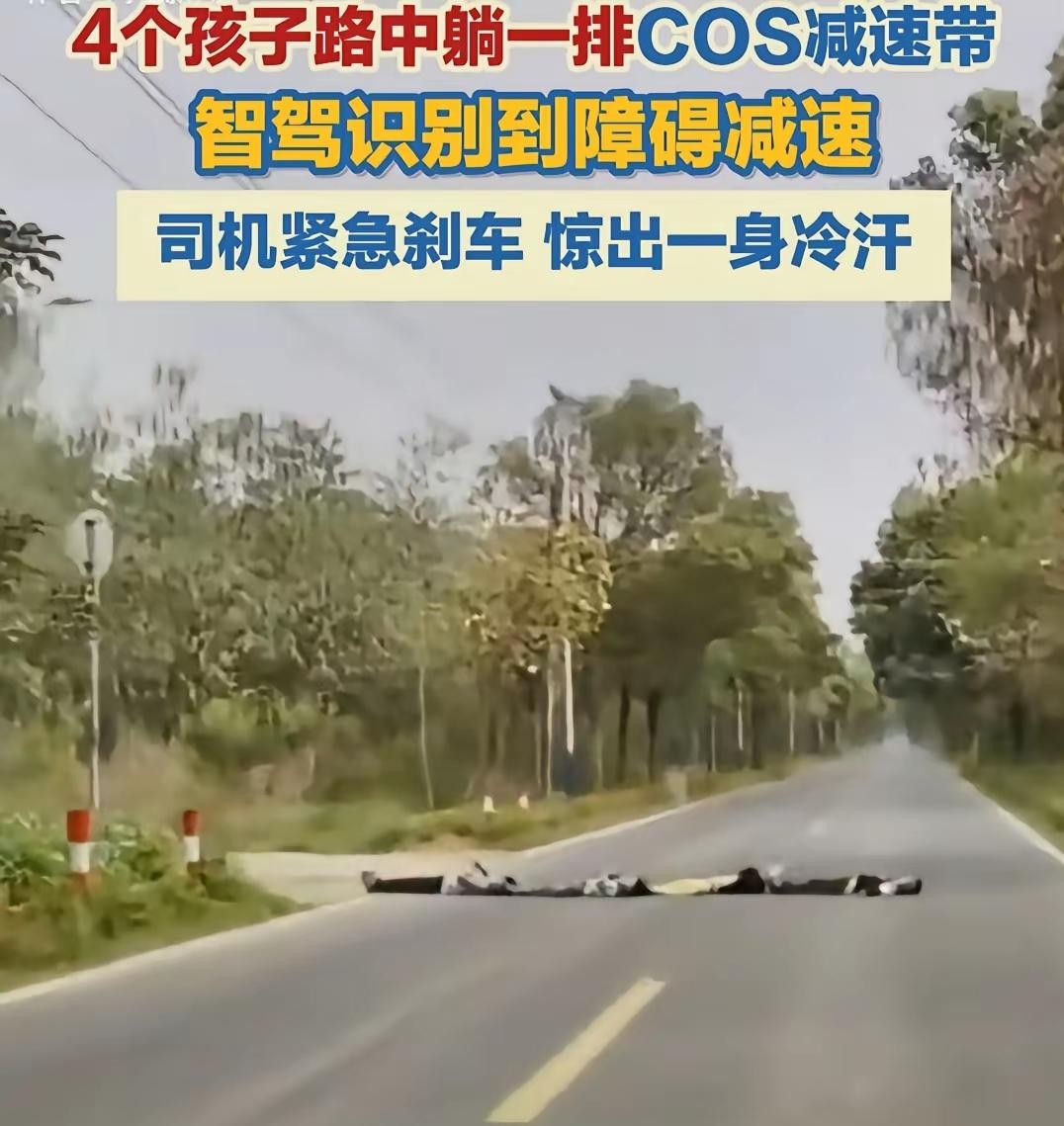 吓出冷汗!广东4个小孩路上COS减速带,司机差点直接碾上去! 起因是一位司机大哥带着老婆在县道上行驶,远远就看到蓝黄黑相间的“减速带”并没有很在意,但是辅助驾驶功能系统一直提示前方有障碍物。在妻子的催促下他切换成手动驾驶并且减速急刹车,然后才看清,看上去像是减速带的障碍物,竟然是4个孩子。孩子们看到车辆停下来,才慢吞吞心满意足地离开了。后来当地镇政府回应说,当天就有村干部入户了解具体情况,并且对孩子和家长进行教育,要求加强监管、重视此事。 多危险啊~这要是辅助驾驶系统失灵,或者是驾驶人眼神不太好,又或者是来不及刹车……都会酿成大错。如果事情真的发生了,孩子惨不惨,司机冤不冤?这可不是初生牛犊不怕虎,这是无知者无畏,这是家庭和学校安全培训和教育没有到位! 孩子们的命和司机的命,都是一条!为人父母,除了给孩子吃饱穿暖,更得给他们套上一层安全的“护身符”。这事真的经不起万一,必须反复叮嘱:马路不是游乐场,乱跑乱闯就是拿性命开玩笑!愿每个孩子都能平安长大,远离危险!