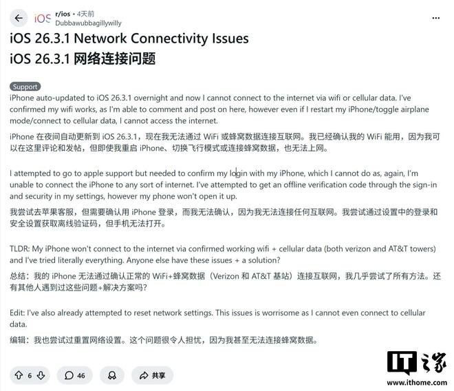 网友u/Dubbawubbagillywilly在Reddit社区反馈,在夜间安装升级iOS26.3.1更新之后,无法正常通过Wi-Fi或者蜂窝数据连接互联网。