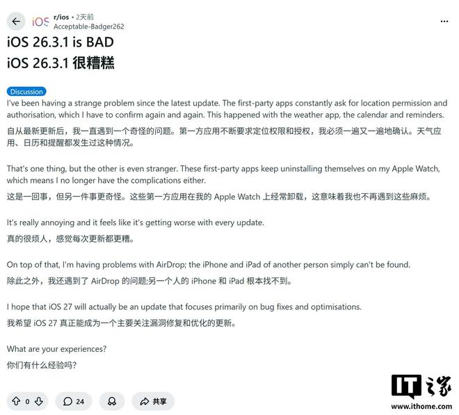 网友u/Acceptable-Badger262反馈,升级后包括天气、日历和提醒在内的第一方应用在更新后仍不断要求位置授权。