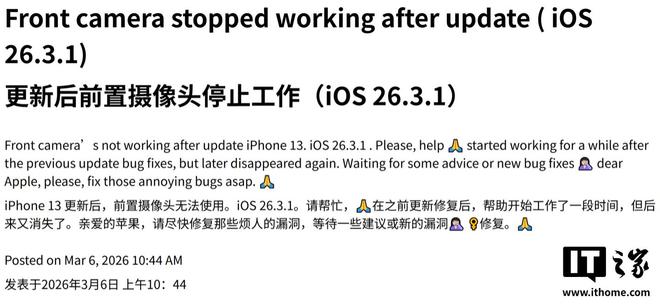 网友russalina28在苹果官方支持论坛反馈,iPhone13的前置摄像头在更新后停止工作。