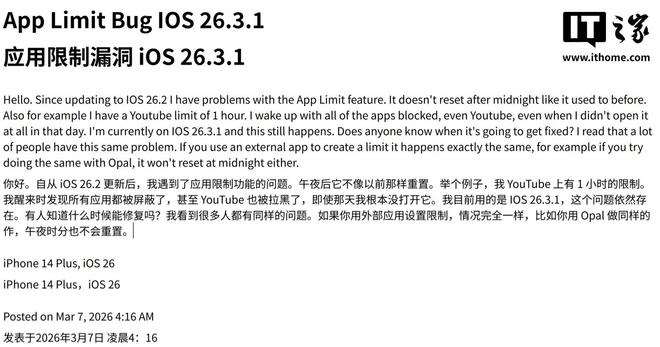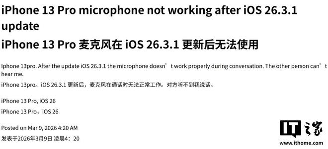 IT之家3月10日消息,科技媒体MacObserver今天(3月10日)发布博文,基于社区用户反馈,梳理了iPhone17等用户升级iOS26.3.1更新(3月5日发布)后遇到的一些问题。