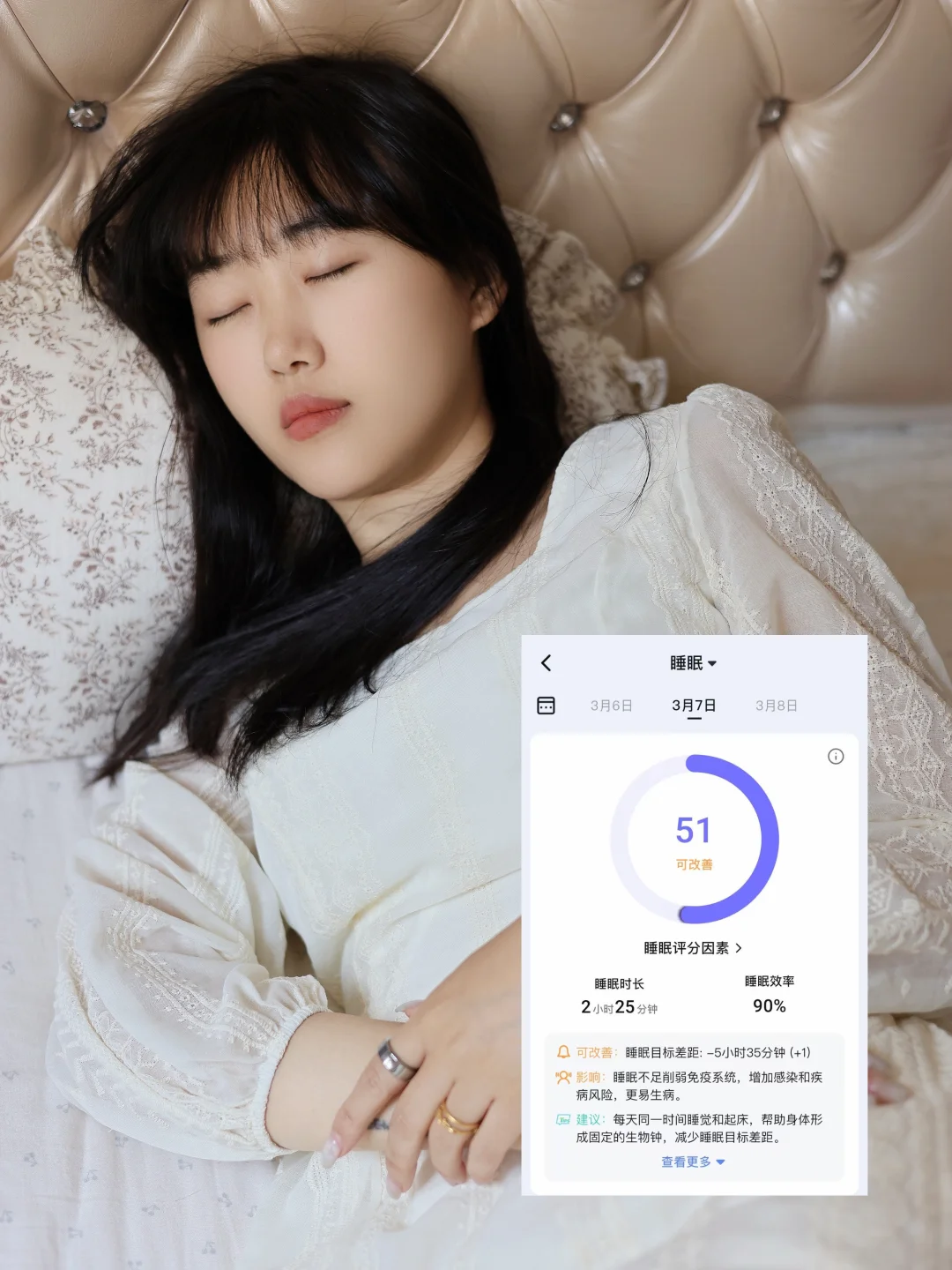 以前没生娃,熬夜是自愿;生娃后,熬夜是被迫——夜里要起来吸奶🍼、换尿布,哪怕躺下也不敢睡太沉,明明闭着眼8小时,白天还是昏昏沉沉、浑身乏力🥹以为是自己体质变差,直到入了RingConn智能戒指,才知道我不是“睡不够”,是“睡不好”‼️