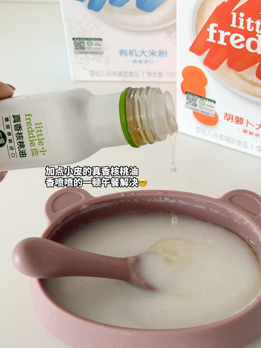 妹妹现在都11个月啦,还给她吃小皮米粉当加餐,加一点小皮的核桃油,香喷喷的一顿晚餐🥣