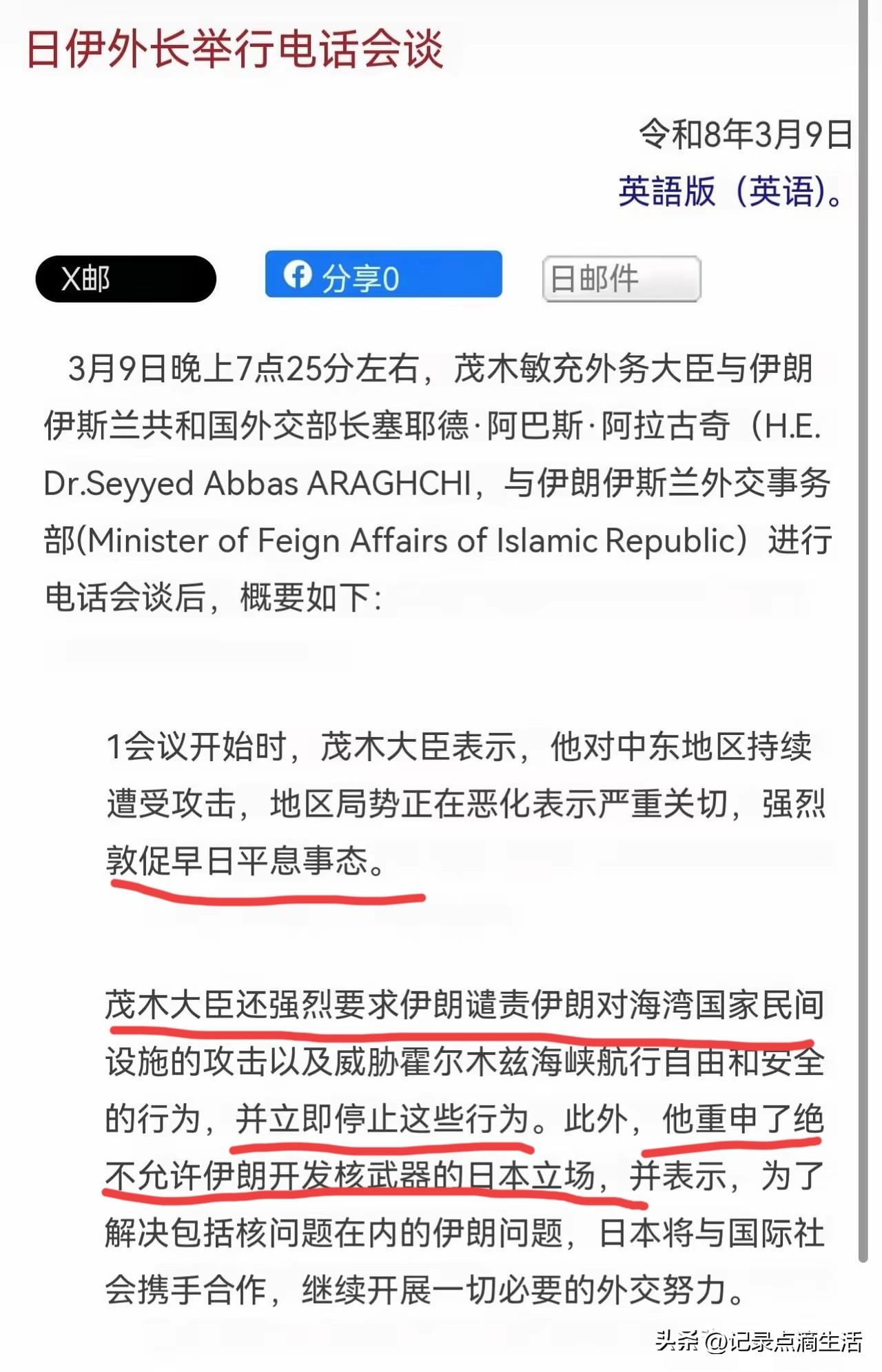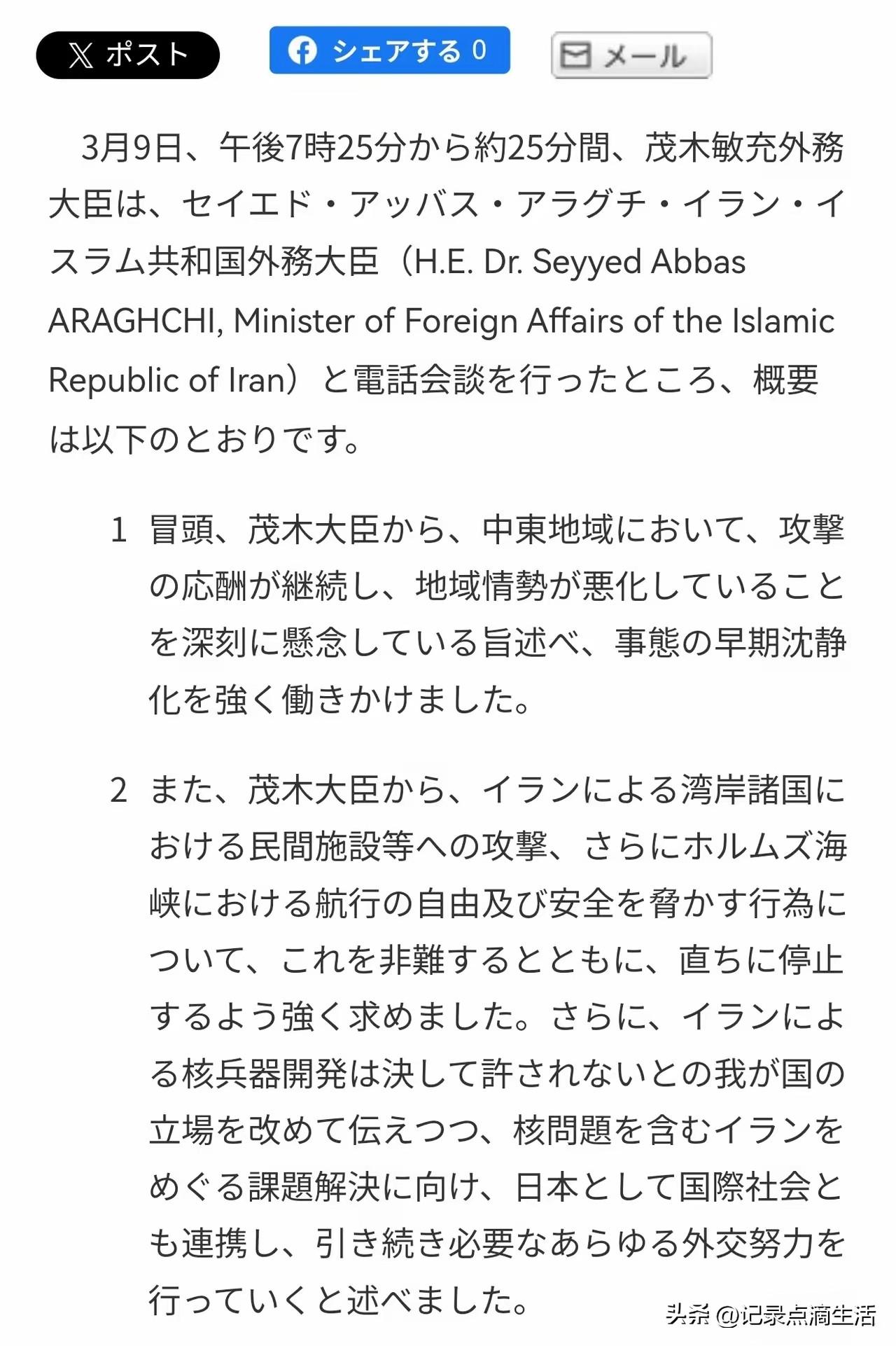 日本外务大臣真把不要脸表现到了极致! 日本茂木敏充和伊朗外交部长进行电话会谈,不去关切和慰问伊朗受战争影响也就算了,还把伊朗给骂了一顿,不敢谴责美国和以色列,竟然睁眼说瞎话谴责起伊朗对中东的轰炸,还要求伊朗早点停止事态发展。 这能是伊朗能够左右的吗,如果他们不还击,是不是才合了日本的心意,简直就是不讲道理。 也不知道伊朗外交部长怎么有耐心听完他这些废话的,直接挂断电话,告诉他们什么时候想明白了再聊就行了,期间任何有日本背景或者日本籍的船都不让过霍尔木兹海峡,直接掐断他们的能源供应,看他们还能嘴硬到什么时候。 伊朗也真愿意惯着日本这人毛病,都已经这样了,还怕他们敢派兵去攻打不成。