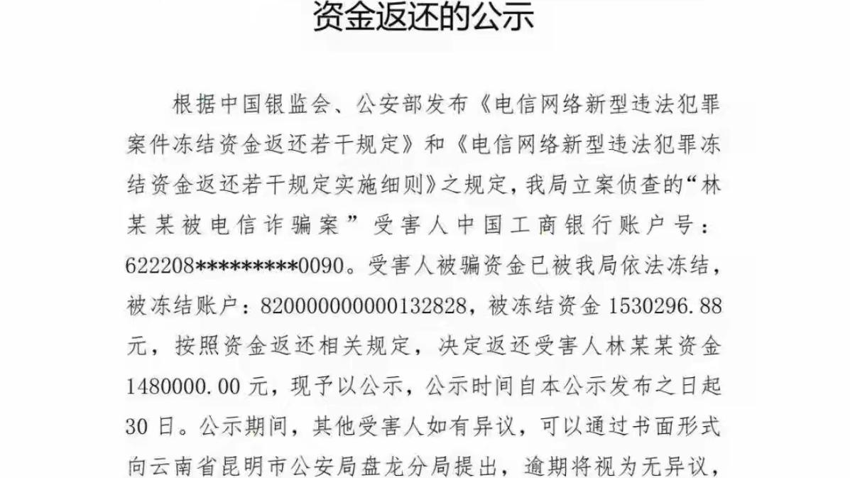 🔥速看!盘龙警方紧急公告!电诈冻结资金开始返还,30天内有效 昆明人注意!盘龙警方发布电信诈骗涉案资金返还公告,6个冻结账户将依法返还资金。公告期30天,受害人、利害关系人可提交异议并提供证明材料,逾期视为无异议。地址:盘龙区金瓦路反诈中心,电话0871-65396110。被骗的朋友抓紧核对,别错过领钱机会!电骗电话 诈骗追回攻略