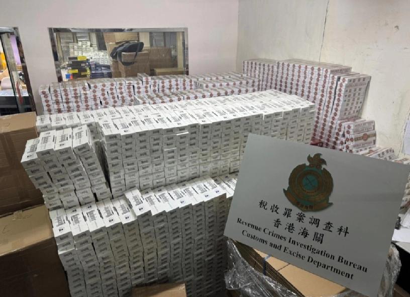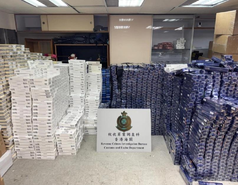 香港海关周一(9日)在葵涌捣破一个怀疑私烟贮存仓库,检获约500万支怀疑私烟,估计市值约2,200万元,应课税值约1,600万元。 香港海关税收罪案调查科调查主任颜令轩表示,海关人员昨晚在葵涌一带工厂大厦进行反私烟行动,行动期间于一工厦走廊发现3名男子正在将一批大型行李箱及行李袋推入一工厦单位。海关人员随即上前截查,于该批行李箱及行李袋内检获约20万支怀疑私烟,并将该3名男子拘捕。
