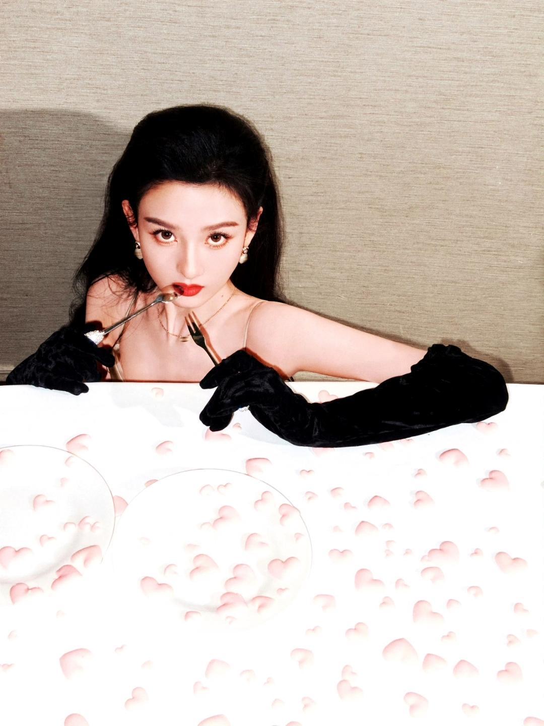 宋祖儿身着香槟色亮片吊带长裙,细肩带勾勒出优美肩颈线条,裙身的珠钻与鳞片在光影下折射出细碎光芒,像把银河揉碎了缀在身上。复古黑丝绒手套搭配蓬松大波浪卷发,红唇点缀间,港风氛围感拉满,举手投足都是老电影里名媛的优雅腔调。