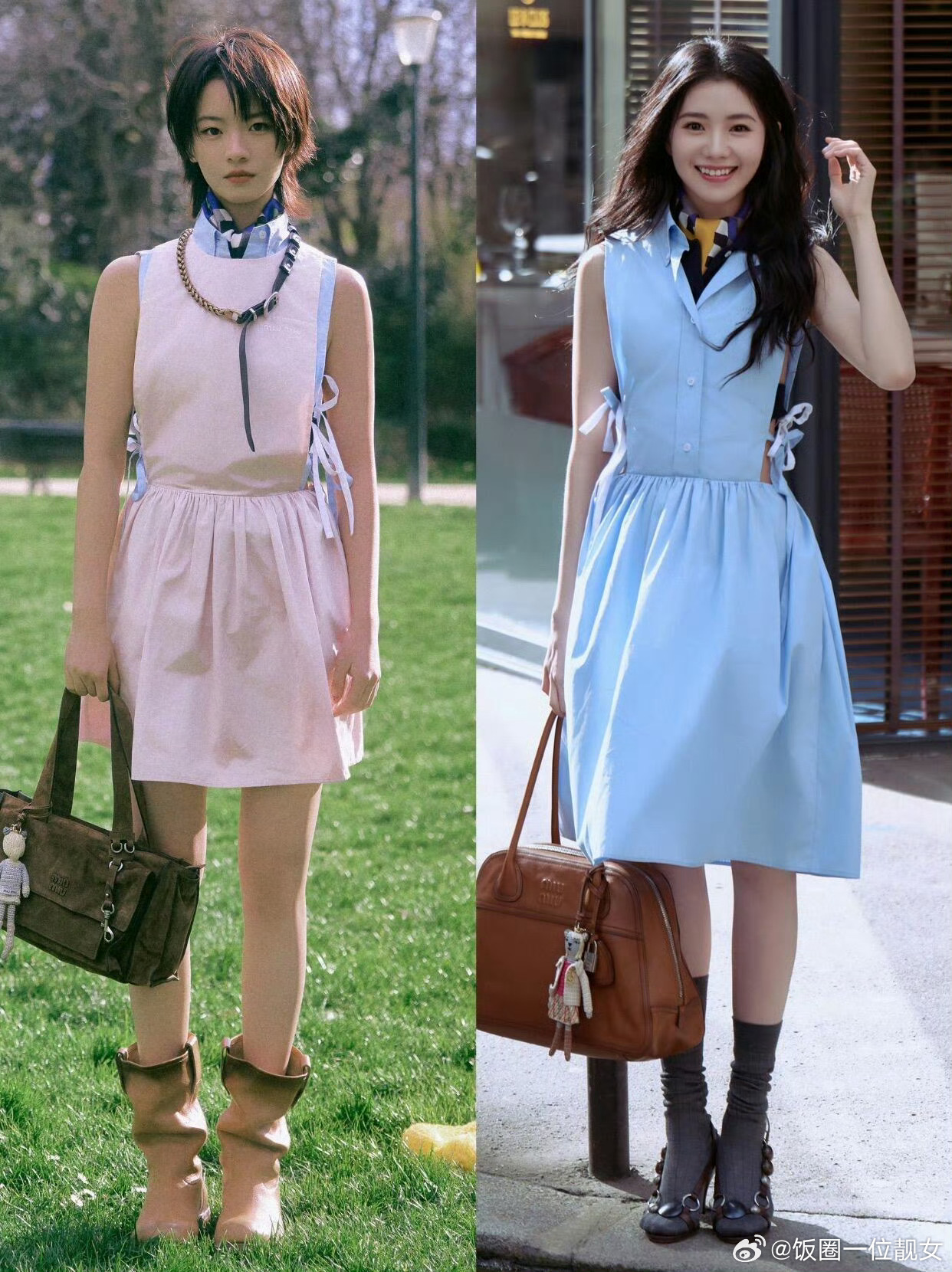 巴黎时装周时装周MiuMiu女孩刘浩存李庚希巴黎时装周,粉蓝无袖连衣裙,清