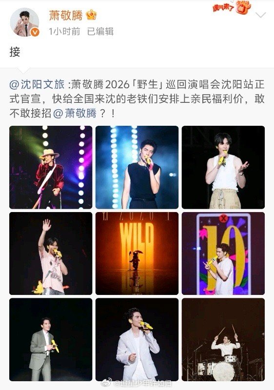 沈阳文旅隔空喊话萧敬腾 萧敬腾沈阳站官宣的同时,文旅直接送上福利大礼包。这种诚意满满的邀请,确实让人想冲现场看雨神。