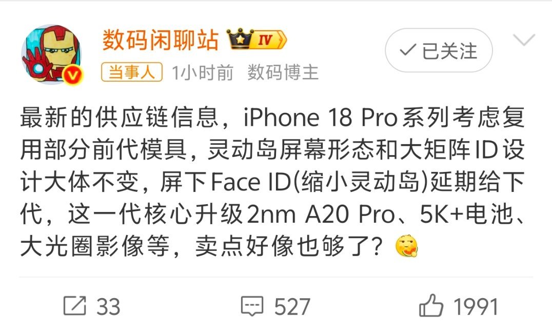iPhone18Pro或无屏下FaceID之前一直传的iPhone18 Pro放弃药丸💊屏改用挖孔屏,然后屏下Face ID。现在又成了复用17系列模具!这一天天的挤牙膏玩呢,麻了…