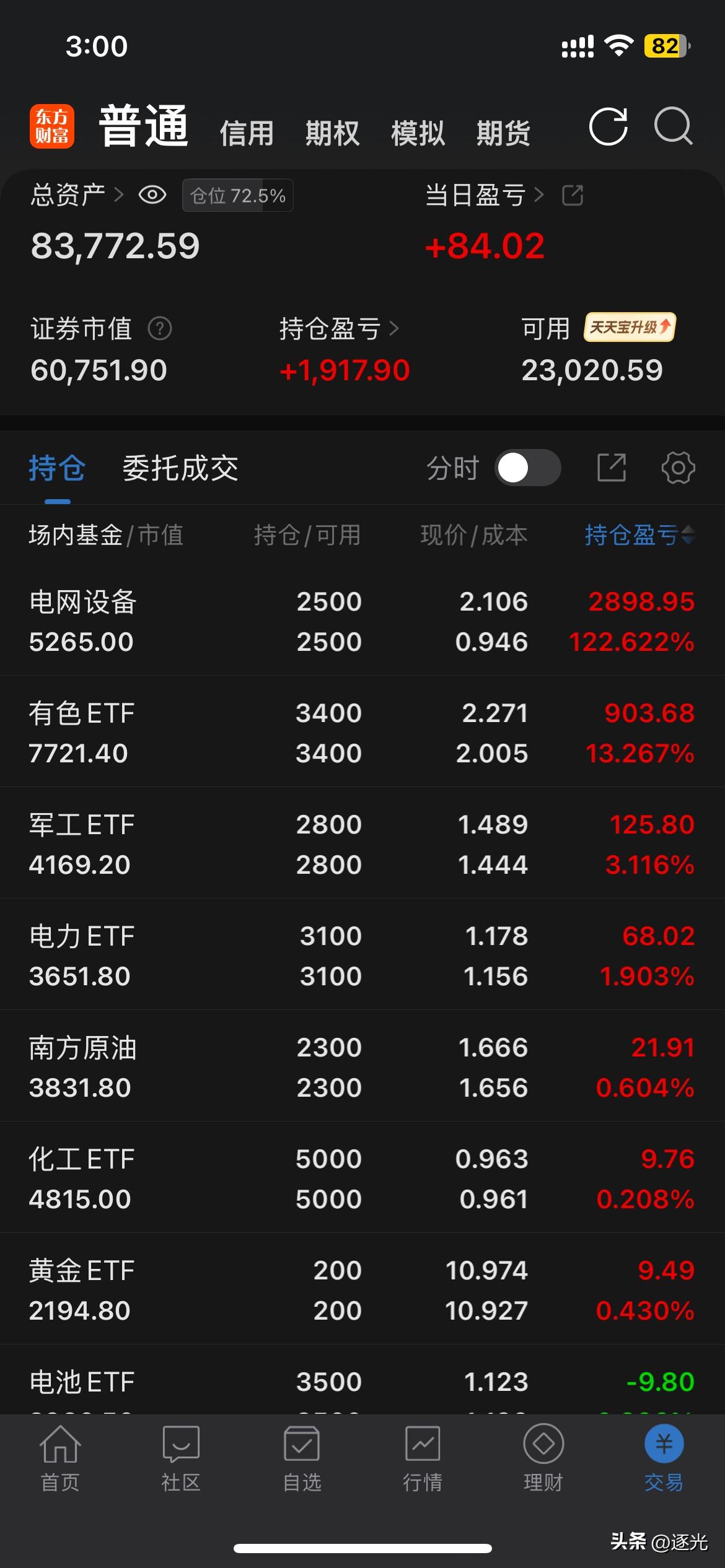 伊朗局势依然不是很明朗,在这种情况之下,股市走势也是很谨慎。全天大盘区间震荡。个股跌多涨少。今天电网设备调整,我的金盘大跌,半山腰补仓了[捂脸]。盈峰上午想做T被洗掉了,很可惜。做T的代价就是被洗。下午又买了点南方原油LOF。今天亏6百多。