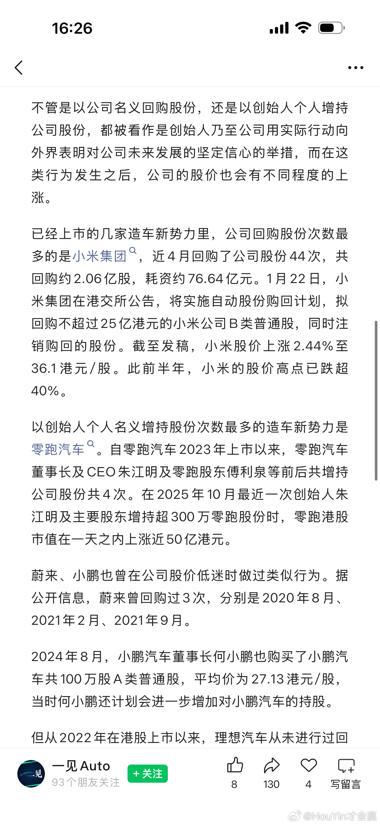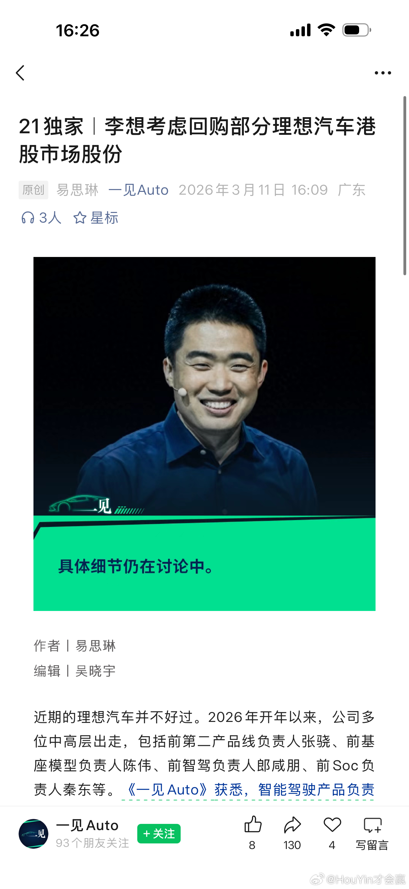 《一见Auto》从多位独立信源处获悉,理想汽车CEO李想近期正在考虑回购理想汽车部分港股市场股份,购回比例以及总额等仍在讨论中。