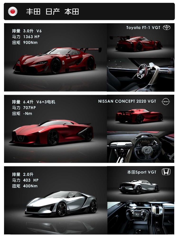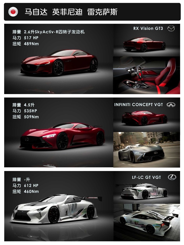 日系三强自己的高端品牌雷克萨斯,讴歌,英菲尼迪也有各自型号的VGT,比如雷克萨斯的LF-LC GTVGT直接把设计语言套用在了LFA上