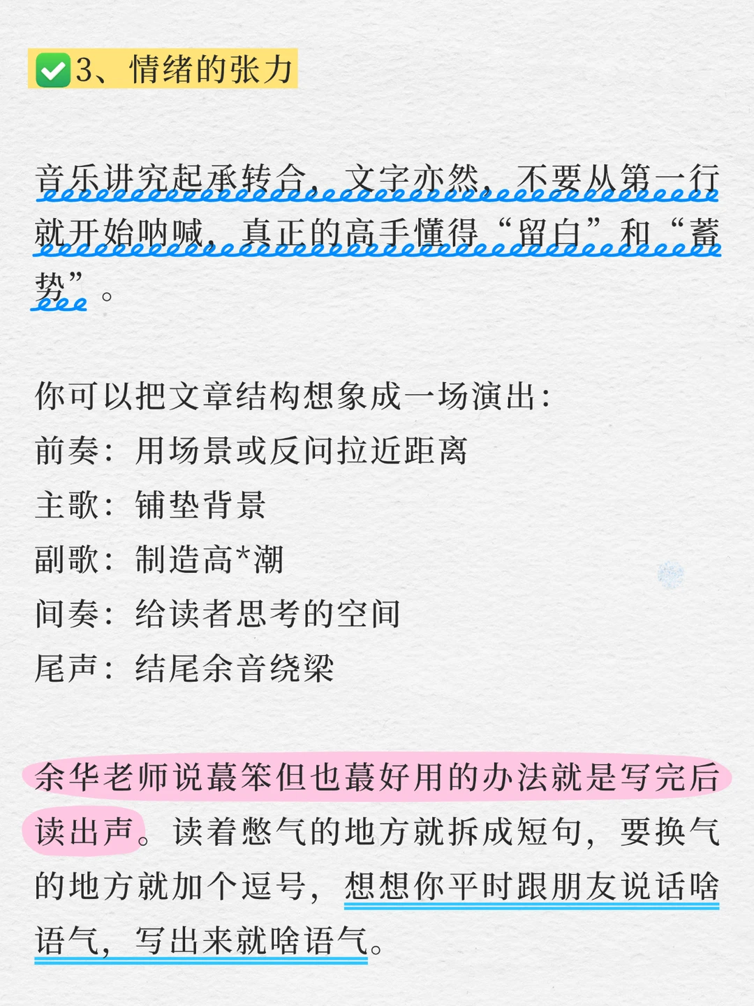 ✨余华老师说蕞笨但也蕞好用的办法就是写完后读出声。读着憋气的地方就拆成短句,要换气的地方就加逗号,你平时跟朋友说话啥语气写出来就啥语气。如写风大就写“风刮得脸疼”,比写什么寒风如刀割要真*实多了。