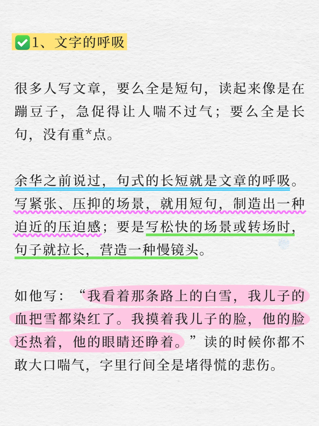 🍂余华说句式的长短就是文章的呼吸,写紧张、压抑的场景,就用短句,制造出一种迫近的压迫感;写松快的场景或转场时,句子就拉长,营造一种慢镜头。