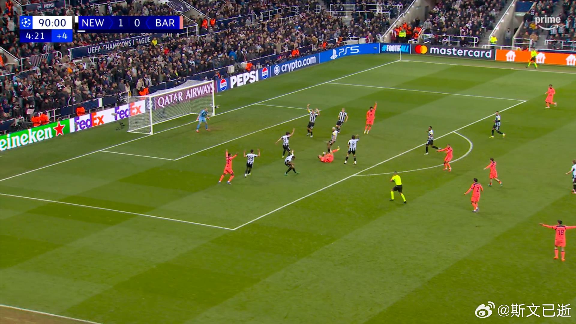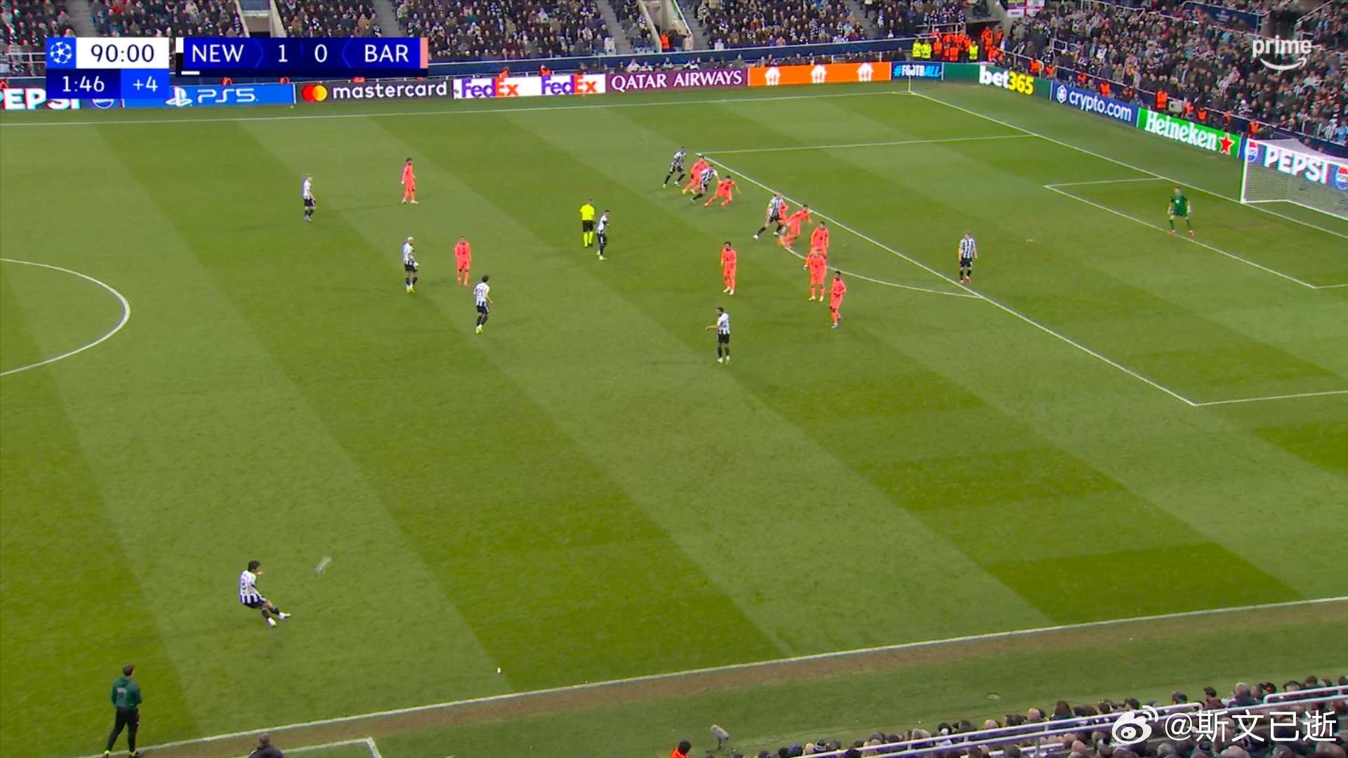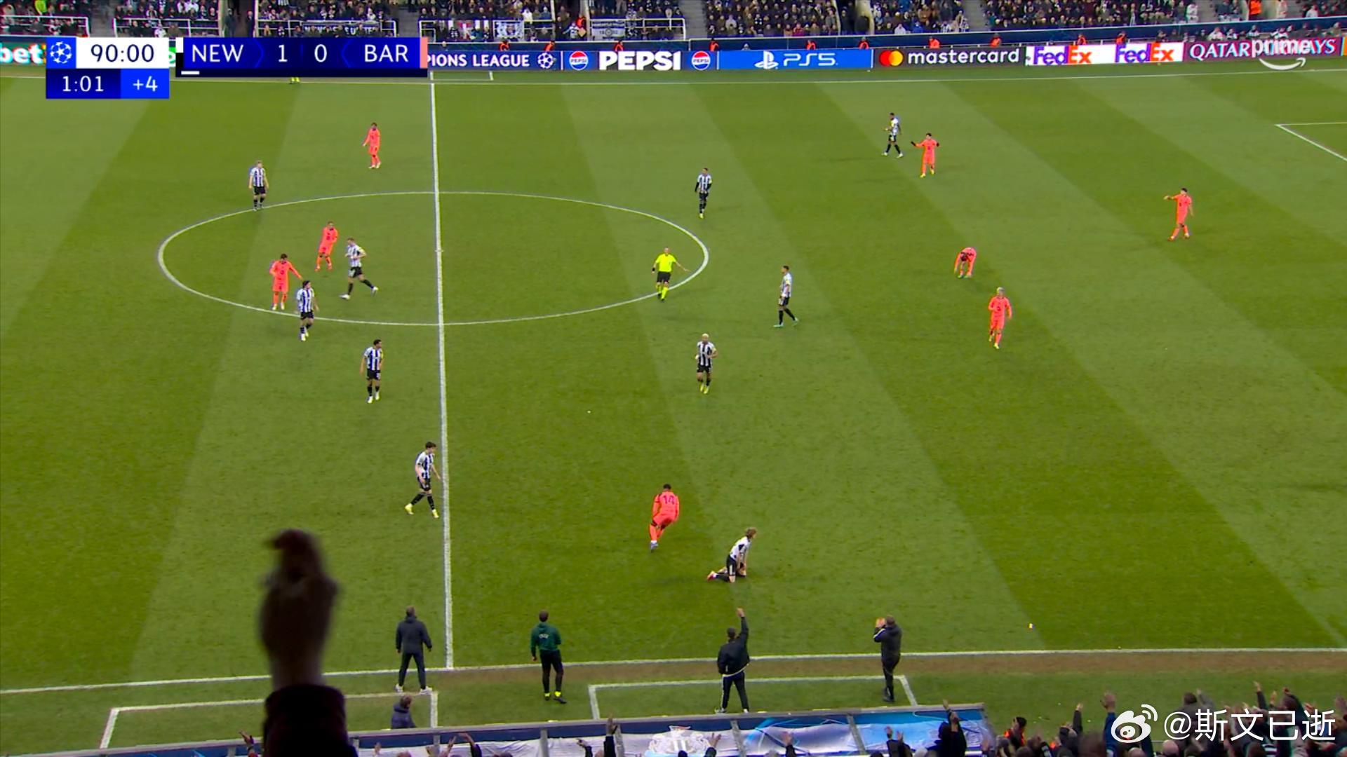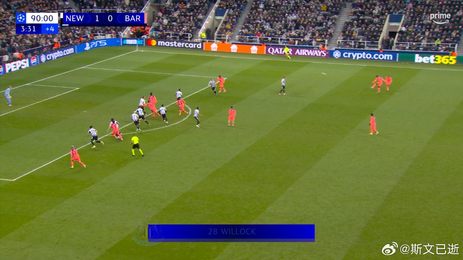 再加上威洛克后来拉拽黄牌,也耽误了半分钟左右的时间,所以巴萨补时第4分21秒犯规送点,在主裁判把这些时间都补够的范围内。纽卡斯尔联1比1巴萨欧冠联赛