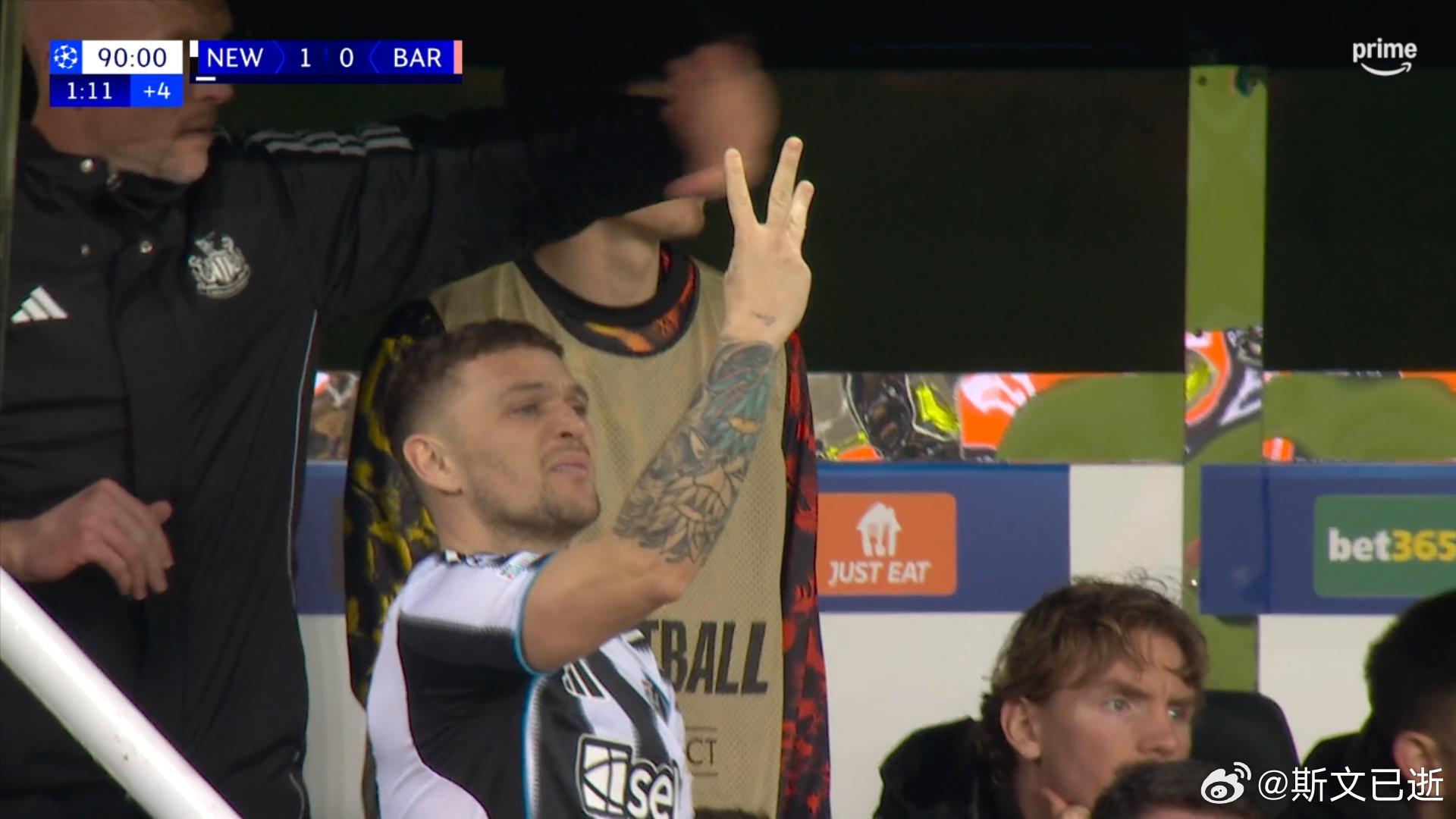 有趣的是,特里皮尔当时给队友比划一个“还剩3分钟”的手势。
