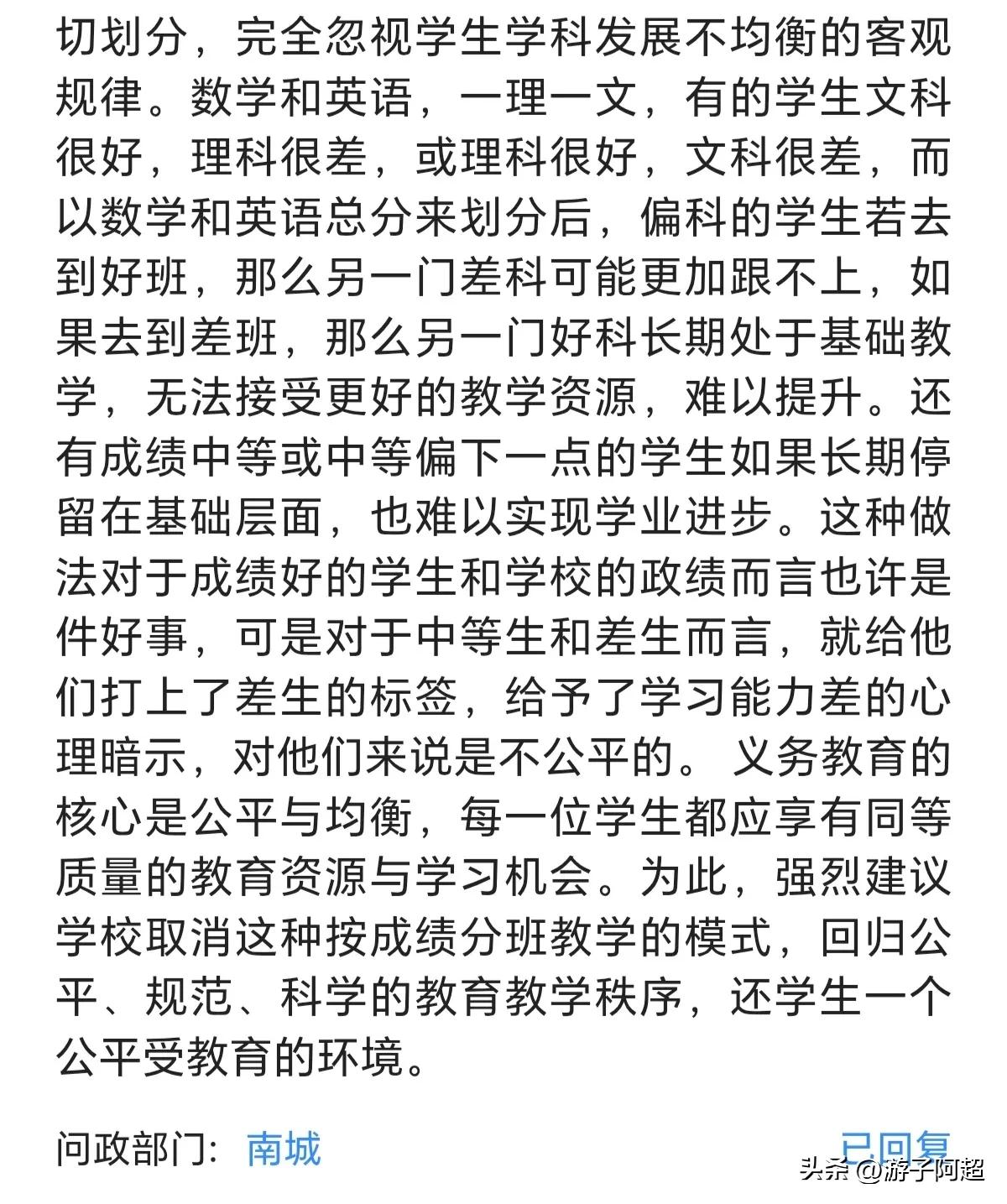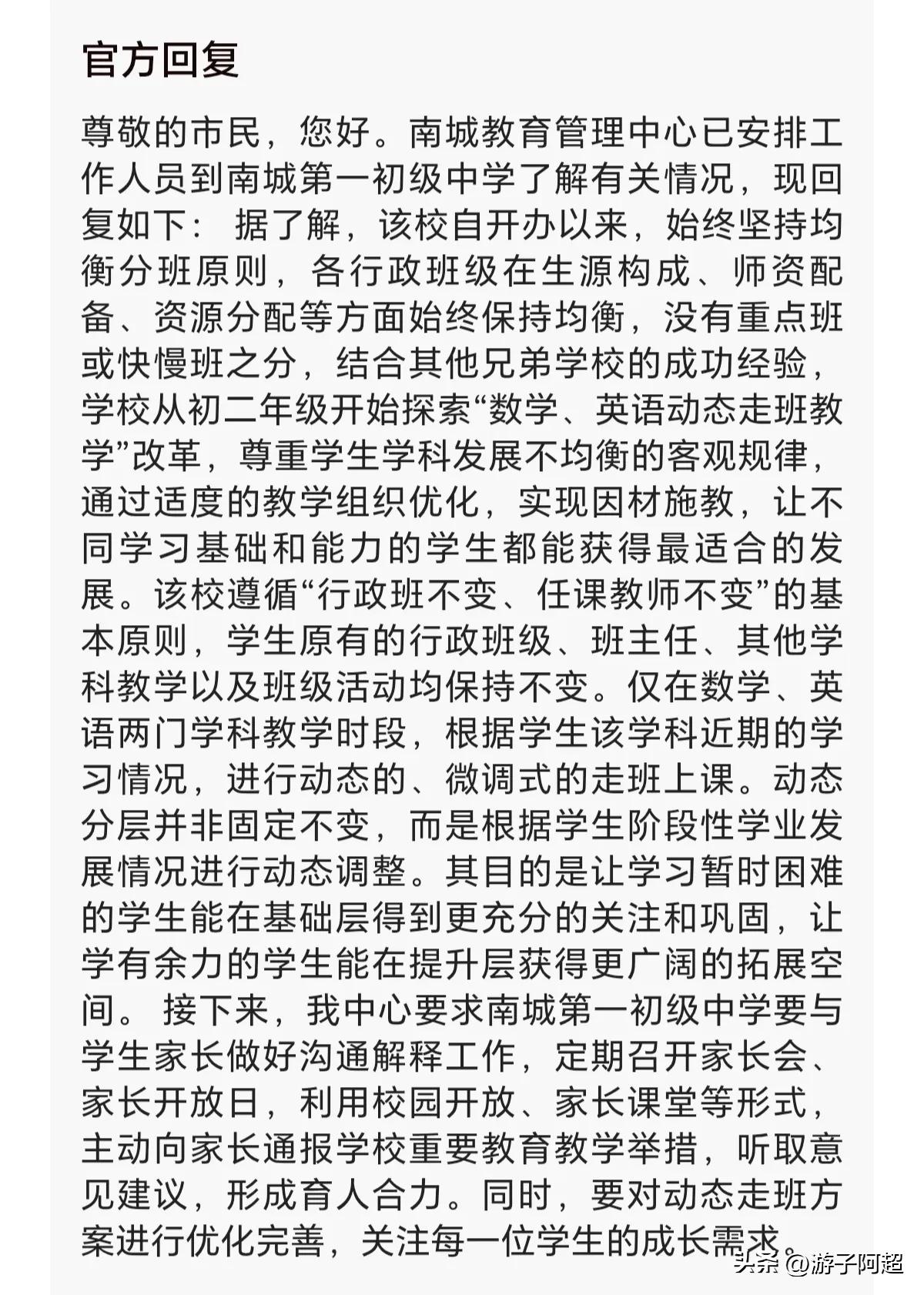 近期,有网友投诉东莞市南城某初级中学依据两门学科成绩分班教学,相关部门调查后已作出回应。 该投诉者指出校方依据英语与数学两科总分将学生划分为A、B班两个层次进行差异化教学,此举涉嫌变相设立重点班级或尖子班,违反了义务教育阶段均衡编班的相关规定。投诉者还列举多项事实,强调此类分组方式损害教育公平性,并对学生学业发展产生负面影响。 经官方核查,该校自初二年级起针对英语、数学两门学科推行阶段性动态教学模式,其目的是实施个性化教学策略,优化走班制实施方案。 针对这种分班教学的做法,家长群体意见不一:有人认为这是科学分班、因材施教的体现,也有人质疑此举存在歧视差生的嫌疑,违背教育公平原则。 校方后续将通过多种途径向公众说明情况,并广泛收集各方意见以促进后续沟通。