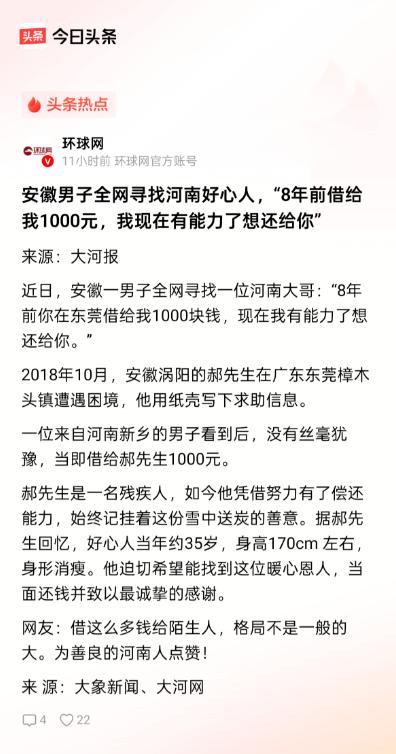 8年前,他在东莞街头收到陌生人1000元;8年后,全网都在帮他找那个河南大哥 这两天,网上有个视频看哭了好多人。 安徽涡阳的郝先生,对着镜头红着眼眶说了一句话:“8年了,这1000块钱,我必须还。” 他要找的,是一个河南大哥。 事情还得从2018年说起。那时候,郝先生还是个在外漂泊的残疾人,一个人跑到广东东莞打工。结果工作没找到,钱也花光了,饿了一整天的他,实在没办法,蹲在樟木头镇的街边,手里举着个硬纸壳,上面歪歪扭扭写着几个字——求助。 来来往往的人不少,但很少有人停下来。 就在他觉得自己快撑不下去的时候,一个声音在耳边响起来:“兄弟,咋回事啊?” 他抬头一看,是个三十来岁的男人,操着一口河南话,个子不高,瘦瘦的。 郝先生当时脸都红了,结结巴巴把自己的情况说了一遍,末了还加了一句:“大哥,我真不是骗子,等我有钱了,一定还你。” 那位大哥没多问,也没犹豫,直接掏出钱包,数了10张红票子,塞到他手里,转身就走。 连名字都没留。 这1000块钱,对当时的郝先生来说,就是救命钱。靠着这笔钱,他慢慢熬过了最难的时候,一步步打拼,日子终于稳下来了。 可那1000块钱,他从来没忘。 他说:“那是我这辈子最难的时候,大哥拉了我一把。现在我有能力了,这钱必须还,这人必须找。” 视频发出去之后,网友们炸了锅: “这就是河南人!仗义,见不得别人受苦。” “那时候的1000块可不是小钱,大哥是真善良。” “一个肯给,一个记得还,这才是最暖的人间故事。” 说实话,这事儿最打动人的,不是钱。 是8年前,一个陌生人伸手拉了一把;是8年后,另一个陌生人拼了命想把这份恩情还回去。 郝先生说,他就想当面把钱还给大哥,再鞠个躬,说一声迟到了8年的“谢谢”。 可惜,他现在还没找到。 如果你认识这位河南大哥,或者有线索,欢迎在评论区告诉我们。 也希望这位大哥能看到——当年你随手帮的那个小伙子,现在过得挺好,也一直记得你。 好人一生平安。