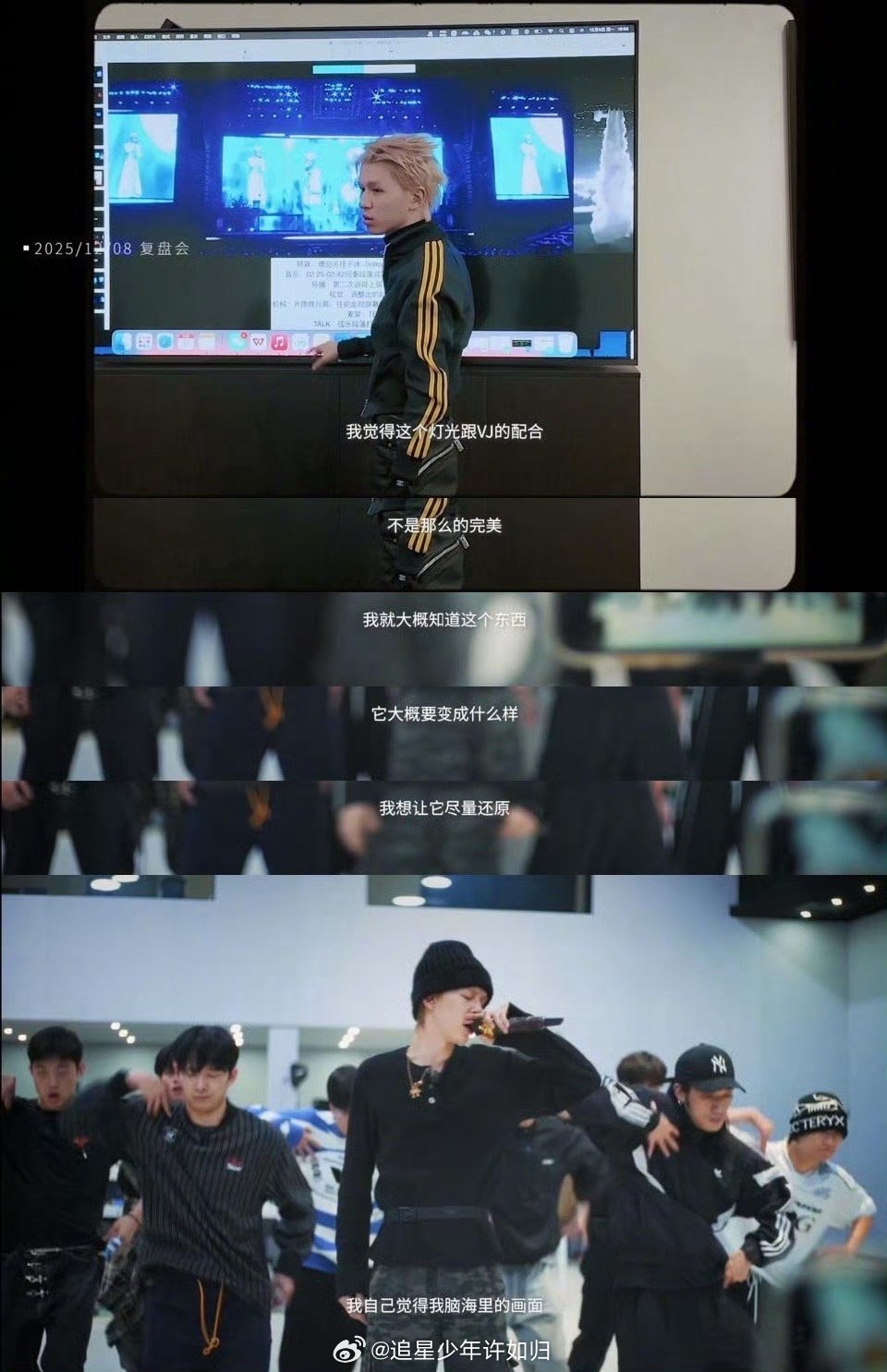 何浩楠复盘会上最严厉的导师 小何对舞台的用心,在复盘会上体现得淋漓尽致。他盯着电脑反复调画面,节奏不对就重来,效果不好就调整。杭州场的精彩,就是这样一点点磨出来的。