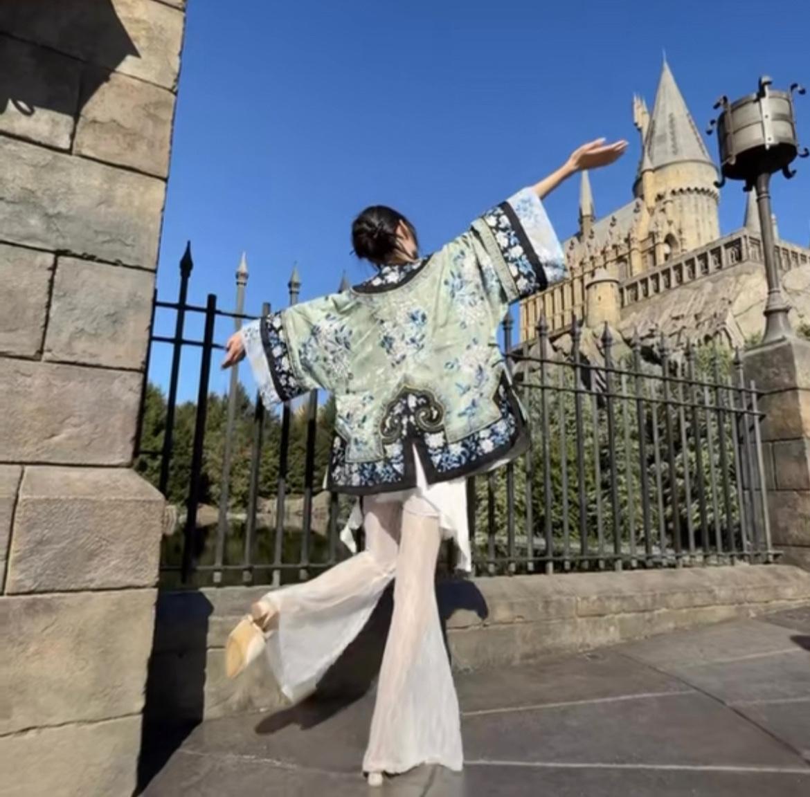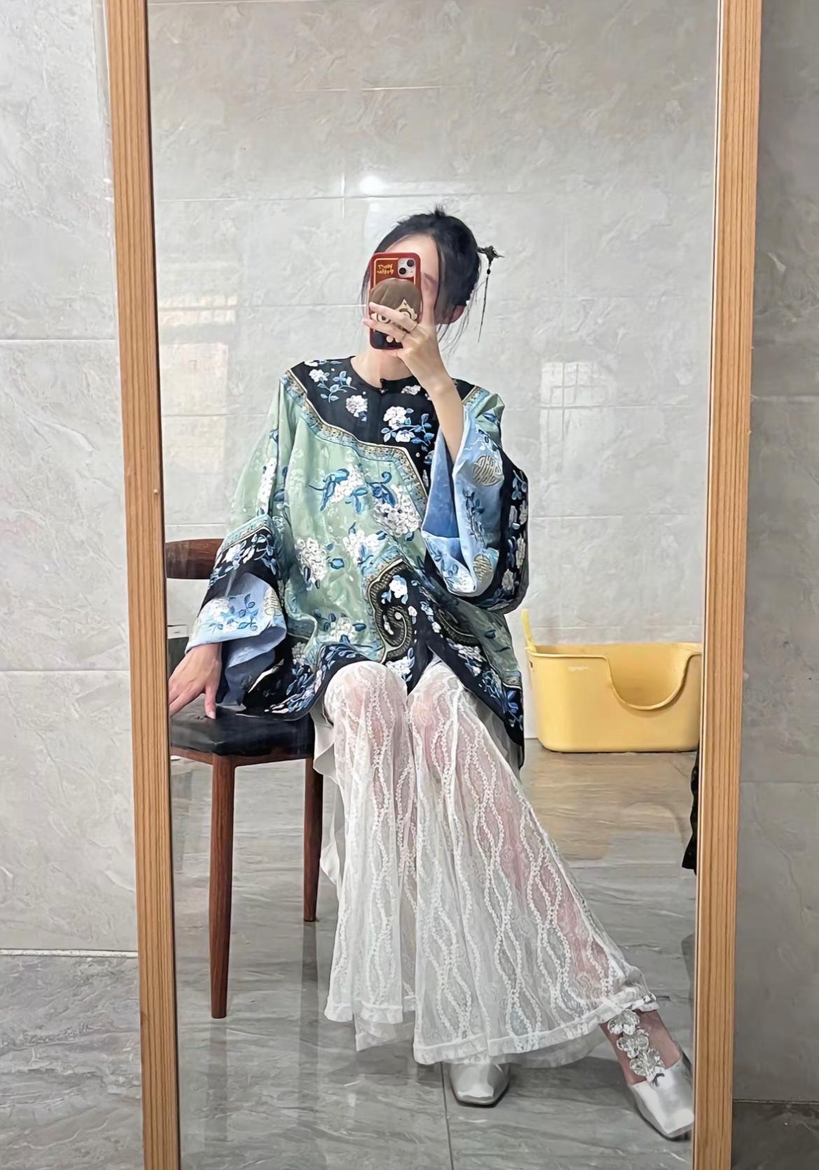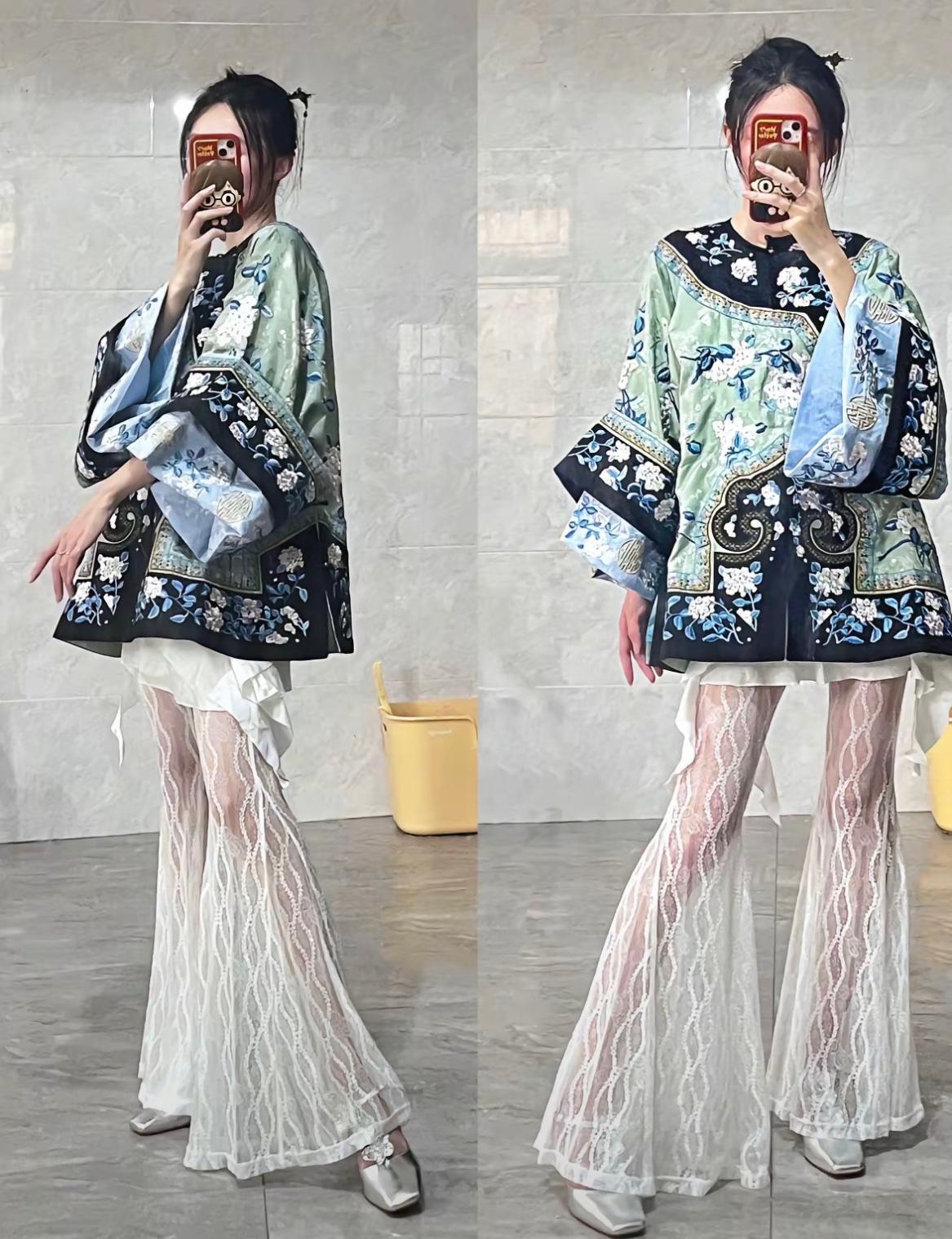 第一次见这种古风和现代搭配的穿搭,上半身像是清代格格,下半身是半透明的裤裙,显得