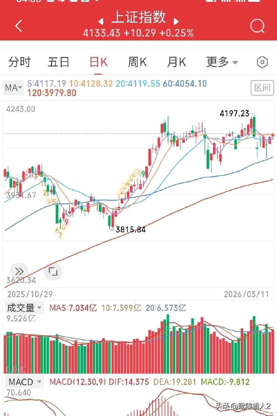 3月12日早评。隔夜欧美股市呈普跌状态(图1)。欧股调整幅度较大,主要原因就是欧洲受能源影响较大。美股三大指数涨跌不一,行情虽较欧股强出一些,但总体走势低迷。那么,A股后期将如何表现呢? 我们先来了解一下全球资金的流动情况。受美伊冲突影响,部分中东国家的资金正在离开美股,著名投行高盛也在慢慢布局A股。A股市场是不缺资金的。大家不要羡慕韩国、日本、印度股市涨了多少多少,A股的稳定环境和人民币升值一定会逐度吸引更多的长期外资,后劲很足,后期基本上就是慢牛爬坡的走势,爬累了就在一块平地上躺上一段时间,然后继续上行。 从技术层面看,以沪指为例,我们发现日K线中的20天均线在经过前阶段的横盘震荡后已经出现了上行趋势(图2)。这说明什么问题?说明主力资金在慢慢吸筹,请大家一定不要怀疑。 结合近期市场成交量温和放大的实际情况,毗陵猎人认为市场正在挣脱4050点箱体底部朝着4200点的箱体顶部进军,而且本次冲过4200点大关的可能性较大。理由很简单:只要20天均线拐头向上,一般就会慢慢开启一轮新的上涨行情,如果诸位不相信,可以去查看A股历史上任何一次20天均线上行的走势。现在我们只需做到八个字:找准个股、耐心等待。 个人观点,不构成投资依据,不喜勿喷。祝大家今日好运。