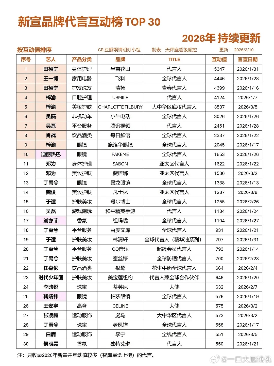 新品牌代言互动榜Top30~
