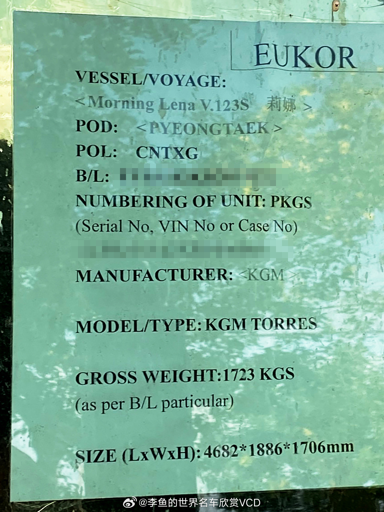 有点难度的猜车,不是国产车哦去年在天津港遇见的一辆陌生车。虽然设计风格看着和近几年一些国产SUV很像,但确实是辆原装的海外车。有兴趣的朋友可以先不看下面文字盲猜一波—————————实际上它叫KGM Torres,不用觉得陌生,KGM品牌就是原来的韩国SsangYong双龙品牌,2022年被韩国本土财团收购后换的新名字而已(目前logo依然和原双龙一样,KGM品牌名在国际市场上尚未全面注册成功)。Torres这款车2022年其实已经发布生产了,中型跨界SUV,比双龙柯兰多Korando稍大点,和原来的双龙Kyron享御差不多是继承关系。由于2020年双龙就退出了中国市场,后续车型包括Torres也没有正式在国内卖过,当然不排除会有零星几辆平行进口车,这辆可能就是其中之一。还看了看车窗上贴的海运舱单信息,运输的滚装船叫莉娜号。另外装货港写着天津港,卸货港是韩国平泽,对此表示非常怀疑,按理来说KGM Torres只有韩国平泽一家工厂生产,没有任何信息显示它在中国有量产或组装业务,所以是不是提单信息写反了?当然也许还有可能是在中国进行滚装船调度、返销回韩国的什么特殊操作就不得而知了