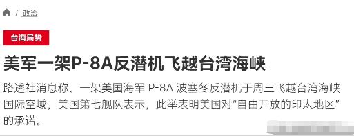 真嚣张!在伊朗脱不开身,美国竟然在台湾又对我们进行挑衅!3月12日,根据法新社报道,法媒称,一架美国海军P-8A波塞冬反潜机于周三飞越台湾海峡,美国第七舰队对此表示称,美国按照国际法在台湾海峡行动,美国维护所有国家的航行权和自由。 美国这波操作看着嚣张,实则是算准了的试探,既想搅乱台海局势,又不敢真的撕破脸。 3月12日这架P-8A波塞冬反潜机飞越台湾海峡,根本不是什么单纯的“航行自由”,而是带着明确侦察目的的挑衅。 第七舰队嘴里喊着国际法,实则连最基本的事实都在歪曲,国际海洋法里压根就没有“国际水域”这一说,台湾海峡是中国内水、领海、毗连区和专属经济区的组合,中国对这片海域享有完整主权,这是不容置疑的底线。 这架P-8A可不是普通的反潜机,它的本事远比表面看起来要大。 机头装的APY-10雷达能全天候盯着海面和陆地,合成孔径模式下能精准识别静止舰船,逆合成孔径模式连快速移动的小船都跑不掉,分辨率能精确到1米以内。 机身还藏着信号情报侦察系统和电子战装备,能捕捉各种电磁信号,监听通讯内容,甚至能应对敌方电子干扰。 机上携带的120枚声呐浮标,比老款P-3C多了一半,一次能监控64个被动声呐浮标和32个主动声呐浮标,反潜能力顶得上3架老式巡逻机。 它飞越台海,根本不是路过那么简单,而是在偷偷收集沿海军事部署、舰船活动轨迹,甚至海底地形数据,这种带着情报搜集目的的飞行,怎么看都和“航行自由”不沾边。 美国所谓的“维护航行权”纯属借口。 台湾海峡本来就允许各国商船正常通行,这些年国际航运从未受影响,真正的航行自由一直都在。 美国偏要派军用侦察机来凑数,本质是想把台海问题国际化,制造“台湾海峡不属于中国”的虚假印象。 要知道,美军舰去年穿越台海的次数已经降到四年最低,只有9次,这背后是解放军在台海周边军事活动的常态化,2022年就有3445架次军机在台海巡航,日均9架次,美军清楚硬闯军舰容易引发直接对峙,所以转而用更灵活的军机试探,既想保持存在感,又想降低冲突风险。 这种挑衅背后,是美国印太战略的核心诉求——构建第一岛链的“拒止防御”,防止中国主导区域局势。 美军在亚太部署了三十七万兵力,第七舰队主力驻扎在横须贺和佐世保,核潜艇屯在关岛,就是想把台海当成牵制中国的筹码。 但现在美国陷入了两难,中东局势紧张让它分身乏术,国防资源被分散,既想在亚太保持压力,又怕和中国发生直接冲突。 五角大楼一边喊着“反对单方面改变台海现状”,一边批准110亿美元对台军售,卖的都是高机动火箭、标枪导弹这类不对称作战装备,本质是想让台湾当“棋子”,用“以台制华”消耗中国精力。 可美国的算盘打得再精,也改变不了实力对比的变化。 解放军东部战区早就保持着全时待战的状态,美军机一进入台海空域,全程跟监警戒是标配,所有动向都在掌握之中。 P-8A的侦察半径再大,也躲不过地面雷达和空中巡逻机的监控,它收集的那些情报,在解放军完善的防御体系面前,根本起不到实质作用。 更有意思的是,美军印太司令一边抱怨中国舰艇“拦截”,一边计划部署无人装备搞“地狱景观”,这种双重标准恰恰暴露了内心的焦虑——美军已经没有绝对优势,只能靠这种小动作刷存在感。 美国之所以敢在伊朗事务缠身时还来台海挑衅,就是赌定中国会保持克制,但这种试探正在不断触碰红线。 《反分裂国家法》已经明确划定底线,一旦“台独”分裂势力突破红线,或者和平统一的可能性完全丧失,国家将采取非和平方式捍卫主权。 美国看似手握主动权,实则是在走钢丝,它既不敢让台海冲突升级,又不甘心放弃这张“台湾牌”,只能用军机飞越这种低成本动作施压。 这种挑衅带来的后果,只会让台海局势更紧张。 民进党当局趁机“倚外谋独”,不断配合美国炒作议题,却忘了台湾的安全根本不在外部势力手里。 美军的军售看似给台湾“壮胆”,实则是把台湾推向更危险的境地,让台湾成为地缘博弈的牺牲品。 而美国自己也在付出代价,频繁的军事动作让其国防工业基础不堪重负,弹药库存消耗严重,在中东和亚太之间疲于奔命,这种战略透支只会让其影响力不断下滑。 说到底,美国这波挑衅本质是力不从心后的虚张声势。 它想通过制造紧张局势打乱中国发展节奏,却没意识到台海局势的主动权早已不在美方手中。 解放军的常态化巡航已经形成有效管控,“海峡中线”的神话早已被打破,任何外部势力的干涉都改变不了台湾是中国一部分的事实。 美国所谓的“航行自由”不过是干涉他国内政的遮羞布,这种既想获利又不想担风险的试探,最终只会搬起石头砸自己的脚,让其在亚太地区的信誉和影响力持续损耗。