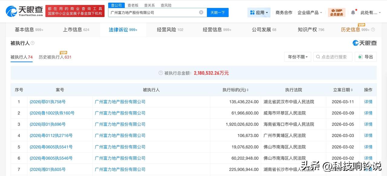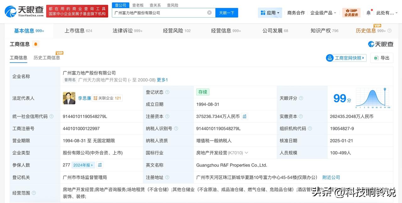 【富力地产等被执行1.35亿】 天眼查法律诉讼信息显示,近日,广州富力地产股份有限公司、武汉东西湖富力房地产开发有限公司等新增一则被执行人信息,执行标的约1.35亿余元,执行法院为湖北省武汉市中级人民法院。 广州富力地产股份有限公司成立于1994年8月,法定代表人为李思廉,注册资本约37.5亿人民币,经营范围包括房地产开发经营、酒店管理等。股东信息显示,该公司由李思廉、张力、陈量暖等共同持股。天眼风险信息显示,该公司现存70余条被执行人信息,被执行总金额超200亿元。此外,该公司还存在限制消费令、失信被执行人(老赖)及终本案件信息。 天眼查信息: