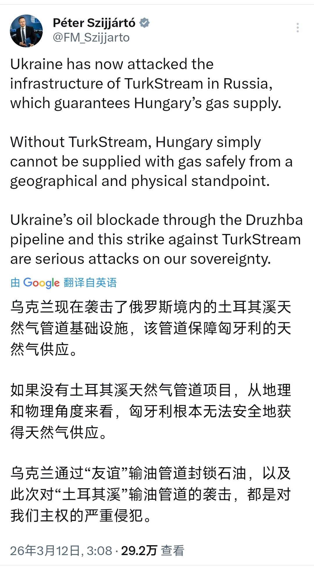 匈牙利外长西雅尔多今天(北京时间3月12日)写道:“乌克兰现在袭击了俄罗斯境内的土耳其溪天然气管道基础设施,该管道保障匈牙利的天然气供应。如果没有土耳其溪天然气管道项目,从地理和物理角度来看,匈牙利根本无法安全地获得天然气供应。 乌克兰通过友谊输油管道封锁石油,以及此次对土耳其溪天然气管道的袭击,都是对我们主权的严重侵犯。” [机智]评几句:当全球关注美以袭击伊朗时,匈牙利和乌克兰的关系急剧恶化。匈牙利外长怒斥乌方袭击土耳其溪管道、封锁友谊输油管道的行径是主权侵犯,字字戳中泽连斯基政府的自私本质。对七成以上天然气依赖俄供的匈牙利而言,土耳其溪是无可替代的能源命脉,乌方为削弱俄罗斯能源出口、敲打持异见的欧盟成员国,将匈牙利、斯洛伐克等国的能源安全视作博弈筹码,全然不顾欧盟此前的安全承诺。这场冲突早已不是单纯的俄乌对抗,更是泽连斯基为绑牢西方援助各位操作,而匈牙利的强硬反击(比如,阻止乌克兰加入欧盟),正是对泽连斯基这种不顾后果的政治投机最有力的回击。