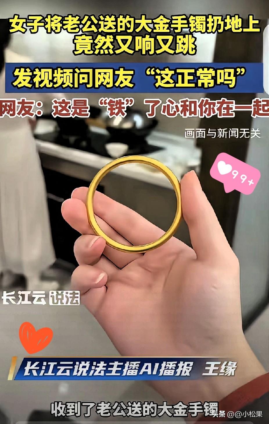 露馅了!女子三八节收到老公送的大金镯,往地上一扔竟清脆作响还弹跳。女子发视频问网友,这正常吗? 民间老话“金不响银不跳”,很多人凭这个辨真假,可放到现在真的不靠谱。真金密度大、实心款落地确实闷声不跳,但现在流行的3D硬金、空心薄壁镯,掉在硬地上清脆回弹太正常了,根本不能当成假货依据。 我觉得比起纠结镯子真假,更该看心意。老公愿意送礼物是疼人,老婆随手测试也是过日子的实在人,一场甜蜜乌龙罢了。真要辨真伪,别靠扔,去正规金店检测最稳妥。 故意送假金伤感情,不小心踩坑可以维权,夫妻之间真诚比金子更珍贵。