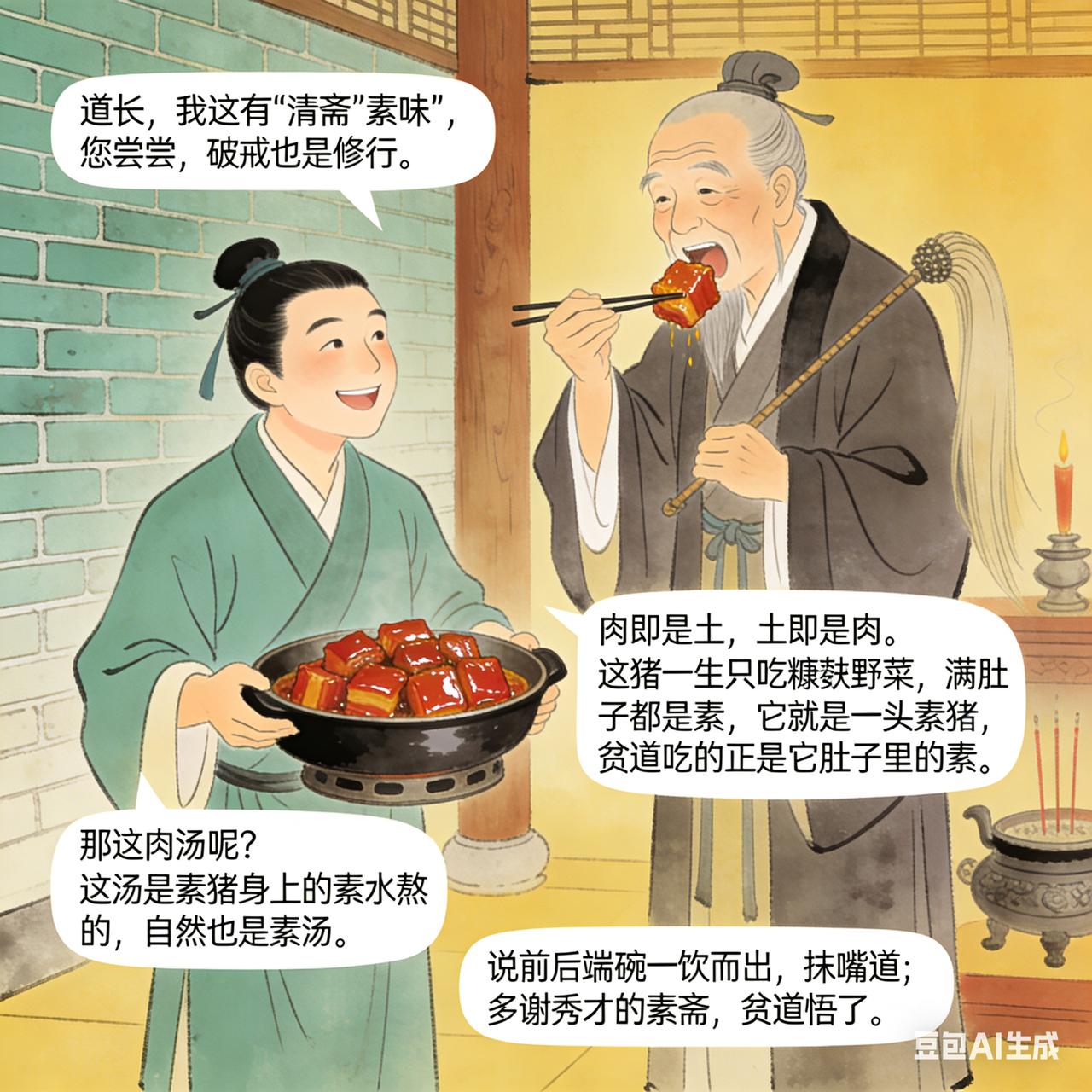 古代笑话 有个秀才总爱捉弄道观里的道长,这天特意炖了锅红烧肉,端到观里笑道:“道长,我这有‘清斋’‘素味’,您尝尝,破戒也是修行。” 道长瞅着油光锃亮的红烧肉,咽了口唾沫,拂尘一甩道:“贫道早已跳出三界,肉即是土,土即是肉。”说着夹起一大块塞进嘴里。 秀才看呆了:“道长,这肉也是素斋?” 道长边嚼边含糊道:“这猪一生只吃糠麸野菜,满肚子都是素,它就是一头素猪,贫道吃的正是它肚子里的素。” 秀才追问:“那这肉汤呢?” 道长舀了勺汤咂咂嘴:“这汤是素猪身上的素水熬的,自然也是素汤。”说完端起碗一饮而尽,抹了抹嘴道,“多谢秀才的素斋,贫道悟了。”