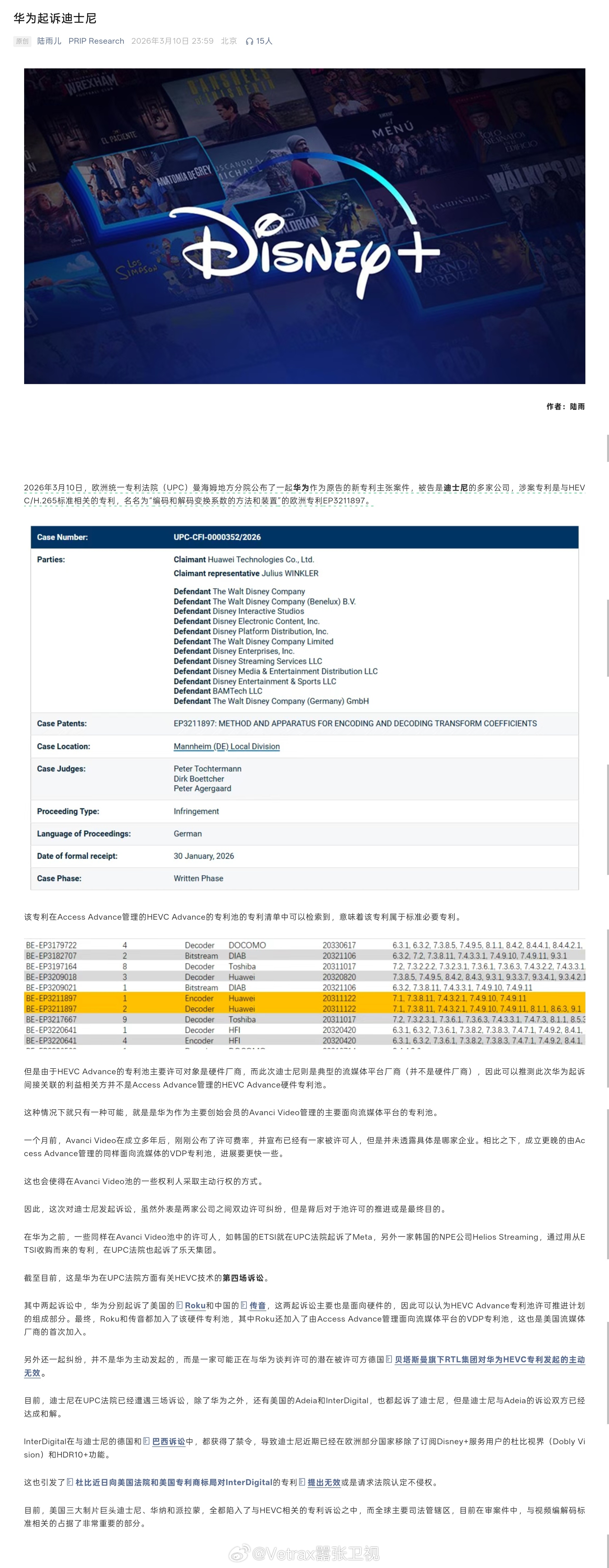 回到华为起诉迪士尼这个案子,2026 年 3 月 10 日,欧洲统一专利法院曼海姆分院公布华为起诉迪士尼旗下多家公司,指控其侵犯与 HEVC / H.265 视频编码标准相关的专利 EP3211897,该专利涉及变换系数编解码技术,属于标准必要专利。这是华为在 UPC 法院发起的第四起 HEVC 专利诉讼。