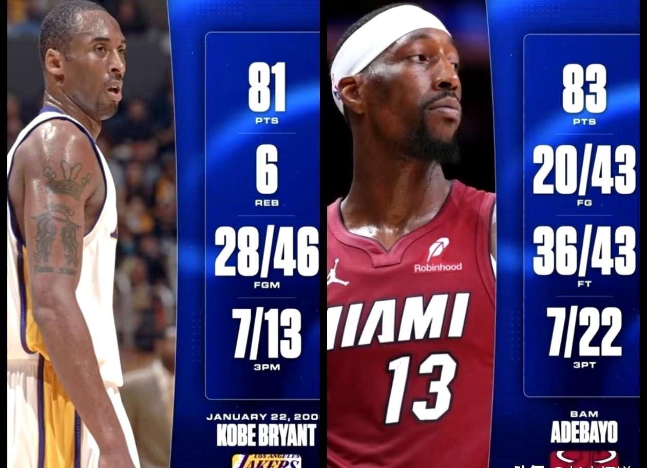 阿德巴约拿83分压过科比81分,评论区吵到热榜第一我都没敢插嘴。 昨儿翻了官方数据,43次罚球破了NBA历史纪录,他全场扛了42分钟,半场就砍43分,热火仨主力缺阵,带着队赢了奇才21分拿6连胜,数字实打实钉在历史第二,仅次于张伯伦的100分。 你说他刷分吧,奇才整场堆两三个人包夹都拦不住他往内线凿,你说他实至名归吧,光罚球就拿了36分,真实命中率比科比当年81分低了7个百分点。 不是旧传奇不够耀眼,而是新赛场总有新惊喜。你认不认这个成绩,历史都替他攥着这滚烫的83分。