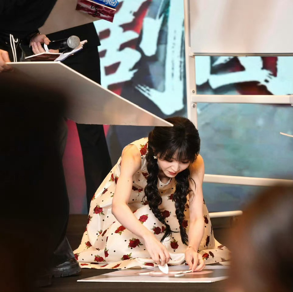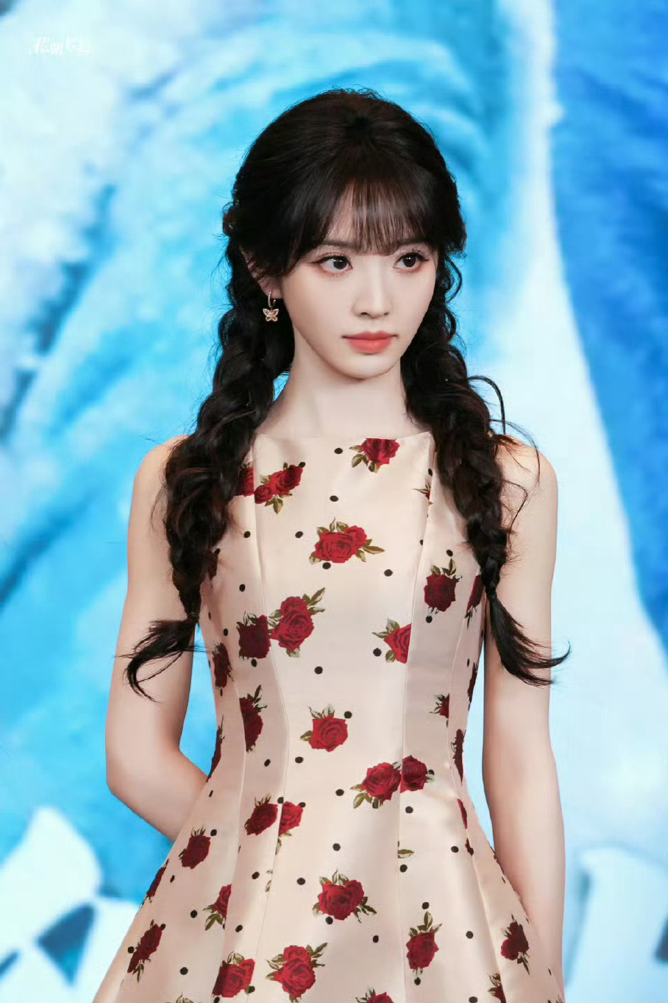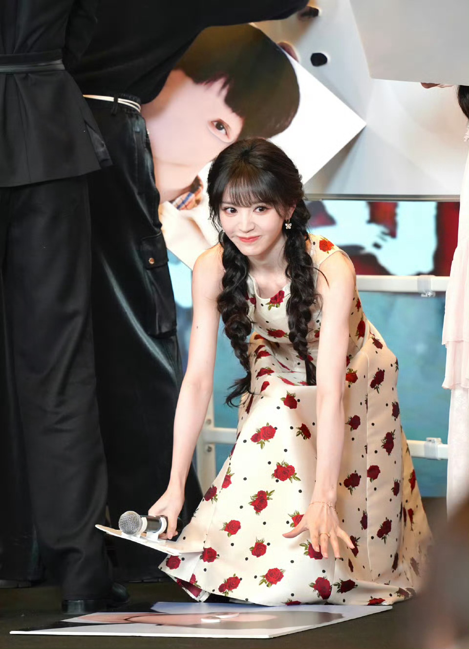 在《逐玉》追剧团活动现场,以一袭缀满红玫瑰印花的浅色连衣裙亮相,双麻花辫造型鲜活