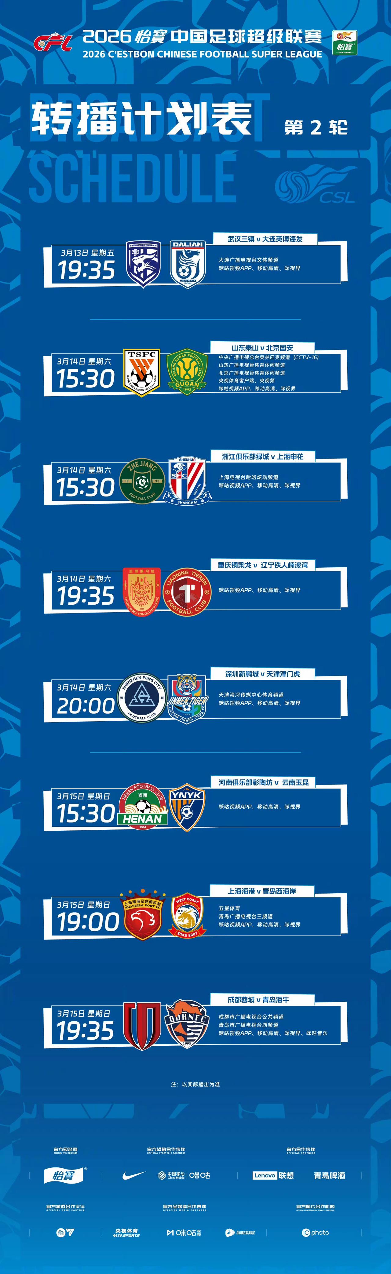 中超第二轮对决,很多球队实力相当,我们来一个神预测(个人观点): 武汉三镇VS 大连英博(负) 山东泰山VS 北京国安(负) 浙江VS 上海申花(平) 重庆铜梁龙VS 辽宁铁人(负) 深圳新鹏城VS 天津津门虎(平) 河南VS云南玉昆(胜) 上海海港VS 青岛西海岸(胜) 成都蓉城VS 青岛海牛(胜) 附带中超第二轮转播表,提醒大家不要错过精彩赛事!