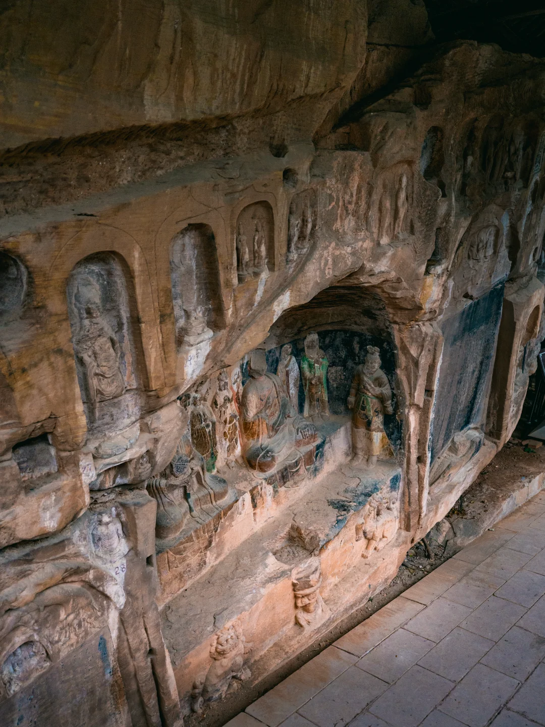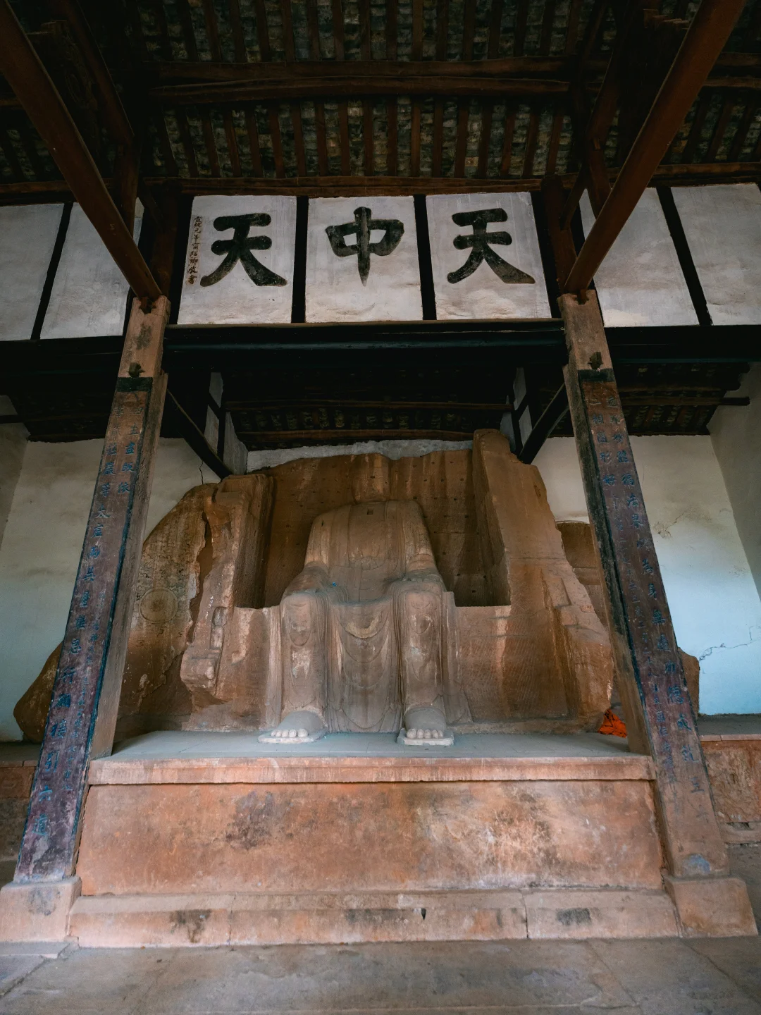 院内还有一尊据说比乐山大佛历史还久远的同款坐佛。而在房后,还有遗存的摩崖石刻,最近这里也正是桃花盛开的时节!