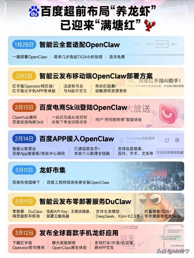 百度“手机龙虾”秒光,OpenClaw创始人喊话求合作,这波操作太顶了~ 昨天百度在科技园办的那个“龙虾市集”,可真是火出圈了。现场人山人海,上千人排队,就为了让百度工程师帮忙装个“龙虾”。队伍里什么年龄段的人都有,甚至还有人牵着边牧来凑热闹,场面堪称互联网时代的新式“赶集”。 这波操作确实够猛的。大集刚结束,百度就甩出了自家的“龙虾”产品DuClaw,主打零部署、零门槛,内置搜索、百科等Skills,还能适配多种主流模型。紧接着第二天,全球首款手机龙虾应用“红手指Operator”上线,瞬间被秒光。 这速度,这热度,别说国内厂商没反应过来,连OpenClaw的创始人都惊了,直接在社交平台上点赞“中国速度”,并表示希望有机会能跟百度共同开发“龙虾”。能让开源项目的创立者主动喊话求合作,这排面,百度算是给国产AI技术挣足了。 其实很多人不知道,百度在这波“养龙虾”热潮里,根本不是跟风者,而是最早下塘的那一个。早在今年1月,OpenClaw刚在国内技术圈冒头,百度智能云就第一个完成了全套适配,紧接着移动端部署方案、电商Skill上架、百度APP接入,一步没落下。 有意思的是,2月14日百度搜索接入OpenClaw后,两天后OpenClaw的创立者就宣布加入OpenAI。这时间线一捋就明白了——百度对前沿技术的嗅觉和决策速度,甚至跑在了OpenAI前面。 短短三个月,百度连发两款“龙虾”应用,从零部署方案DuClaw到手机端红手指Operator,动作之密、落地之快,业内少见。如果说之前的AI竞赛还停留在概念阶段,那百度这一波连环招,等于直接把“代理式AI”从实验室端到了普通用户手里。有评论认为,这标志着2026年正式成为“代理式AI元年”——当AI不仅能聊天,还能跨App帮你打车、点外卖、处理复杂任务,真正的智能入口争夺战,才算刚刚打响。 回头看百度这波操作,起得最早、动作最快、落地最全,已经不是简单的技术秀肌肉,而是给整个行业打了个样:抓“龙虾”不难,难的是怎么让普通人天天能吃上、吃好“龙虾”。在这方面,百度用连续三招证明了一件事——真正的先发优势,不只是抢跑,而是每一步都踩在点上。