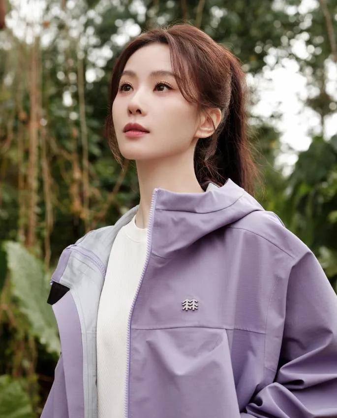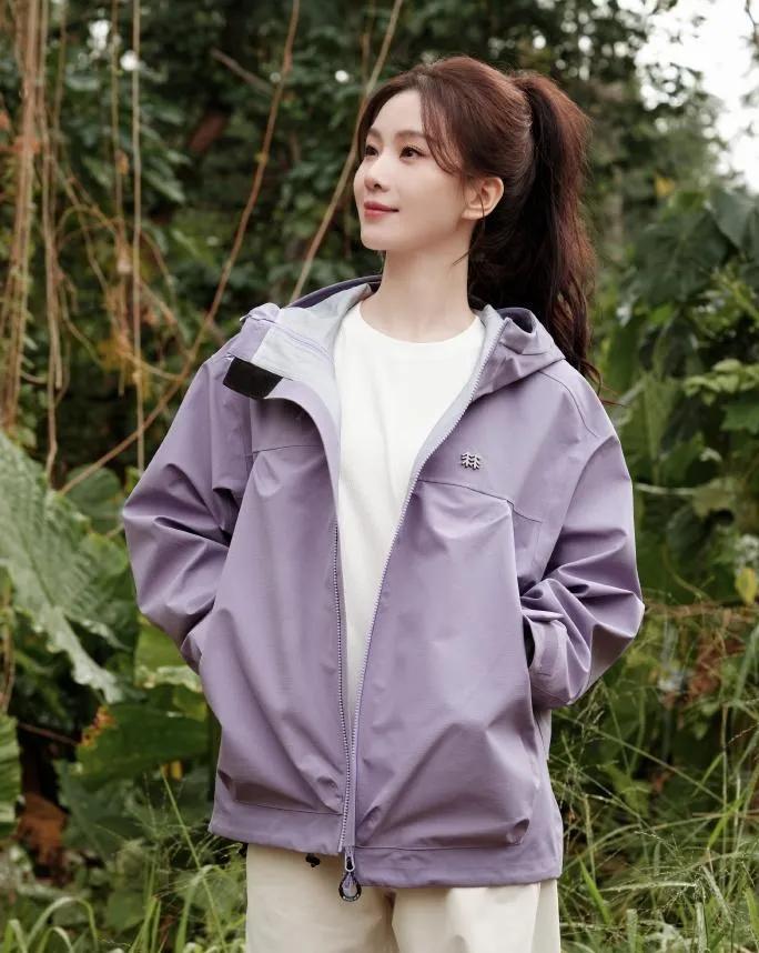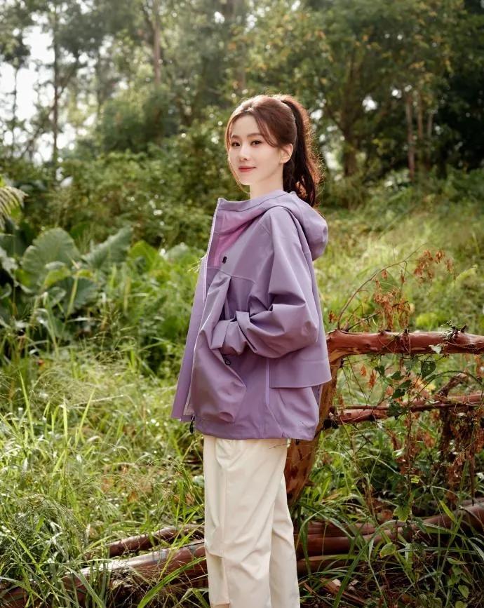 💚刘诗诗把户外休闲风穿得太好看了! 浅紫冲锋衣+白裤,配色干净又舒服,高马尾利