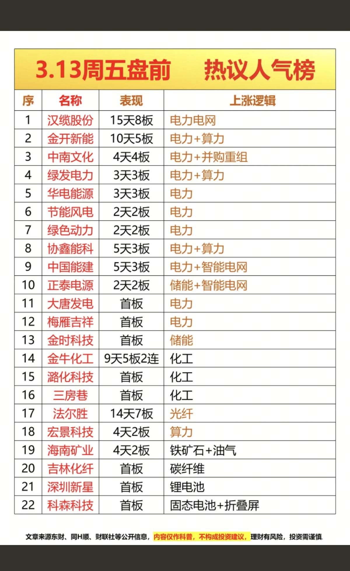 3.13周五 成交活跃个股+人气热搜榜! 1.电力+算力 2.储能+智能电网 3.化工原料 4.光纤光缆 5.锂电池+折叠屏