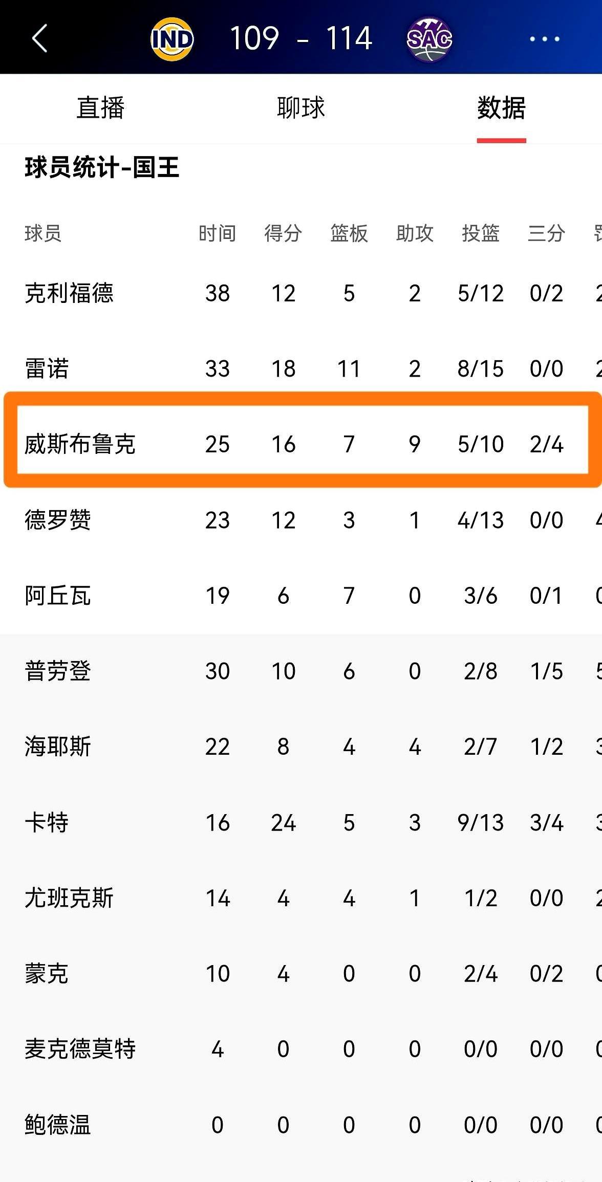 第三节落后20分,国王却在第四节翻盘了,最抢眼的竟是37岁的威少。 3月10日萨克拉门托金州1中心,国王114-109拿下步行者,收下两连胜。 威少首发25分钟,10中5,三分4中2,罚球6中4,16分7板9助,只有1失误1犯规,正负值接近+17。不是刷数据那种热闹,是把节奏稳住、把机会送到队友手里。 逆转的爆点来自德文·卡特:生涯新高24分,第四节一个人轰了22分。雷诺18分11板,德罗赞和克利福德各12分。 步行者这边,内史密斯29分也没能把优势守到终场。 国王战绩16胜50负还在下游,但威少近3场19.3分6.7板10.3助,连带着把比赛变得更像“能赢一阵”的样子。你觉得一支摆在下游的队,更该靠老将撑场,还是早点把球权全交给新人?