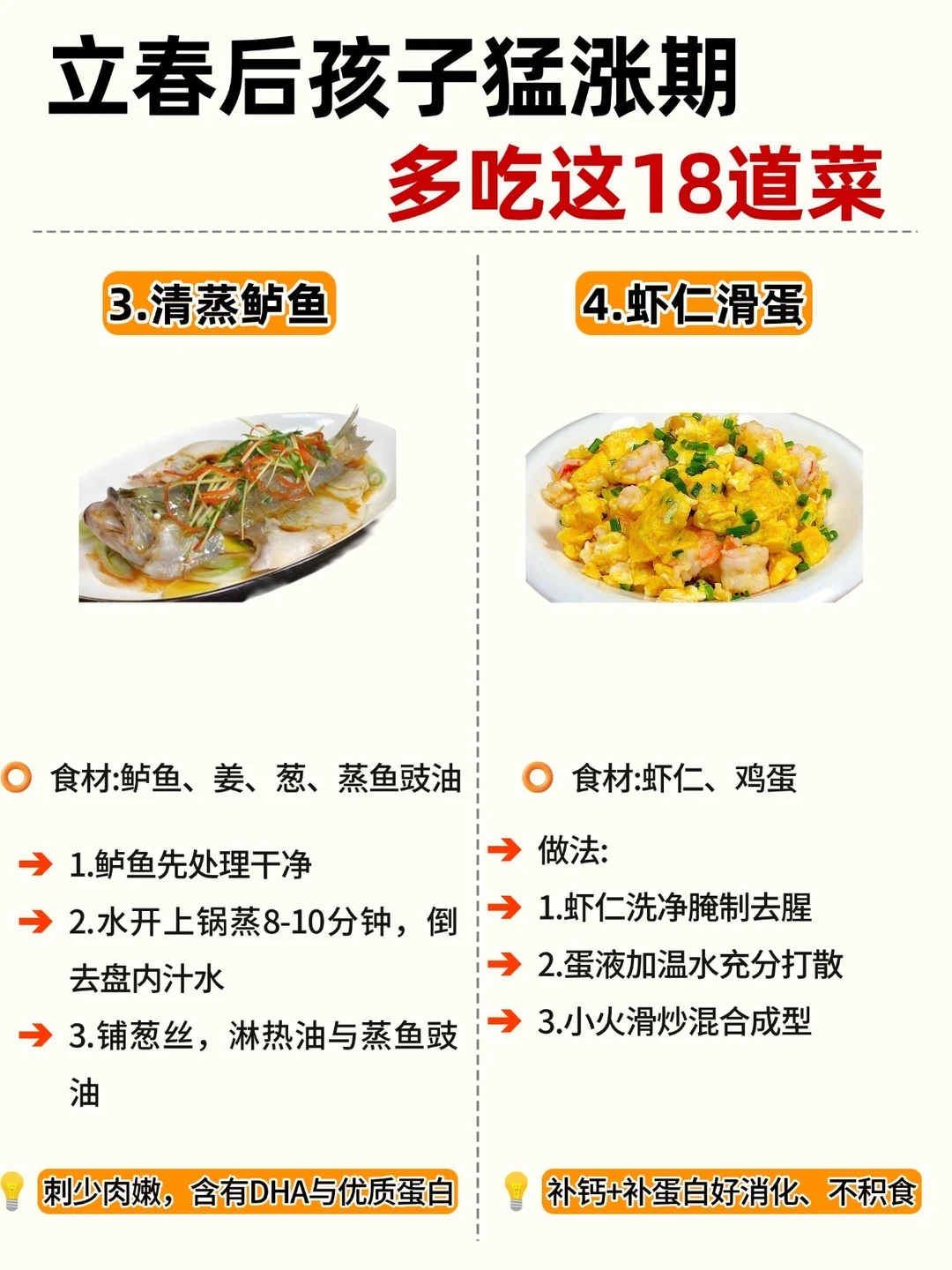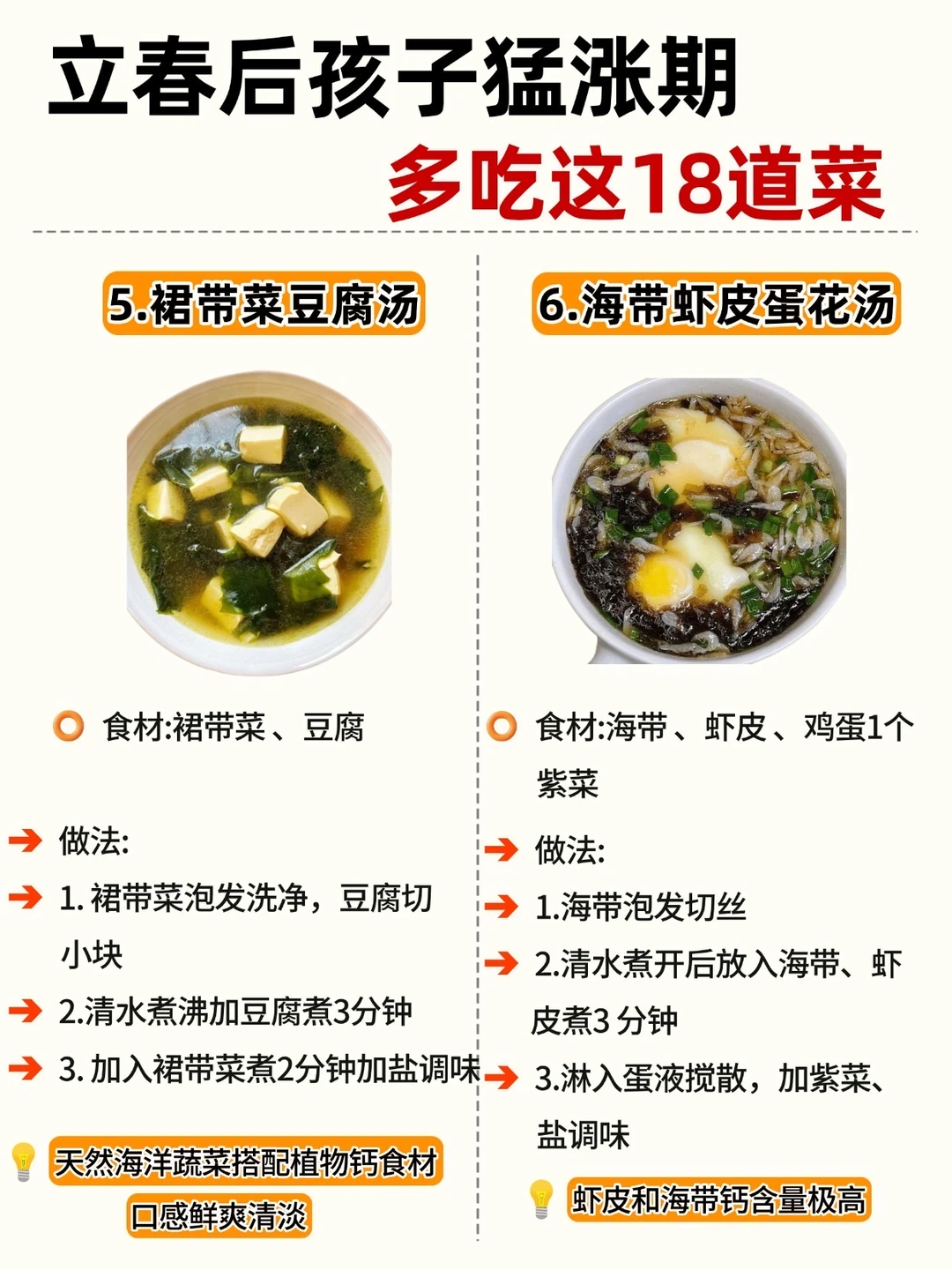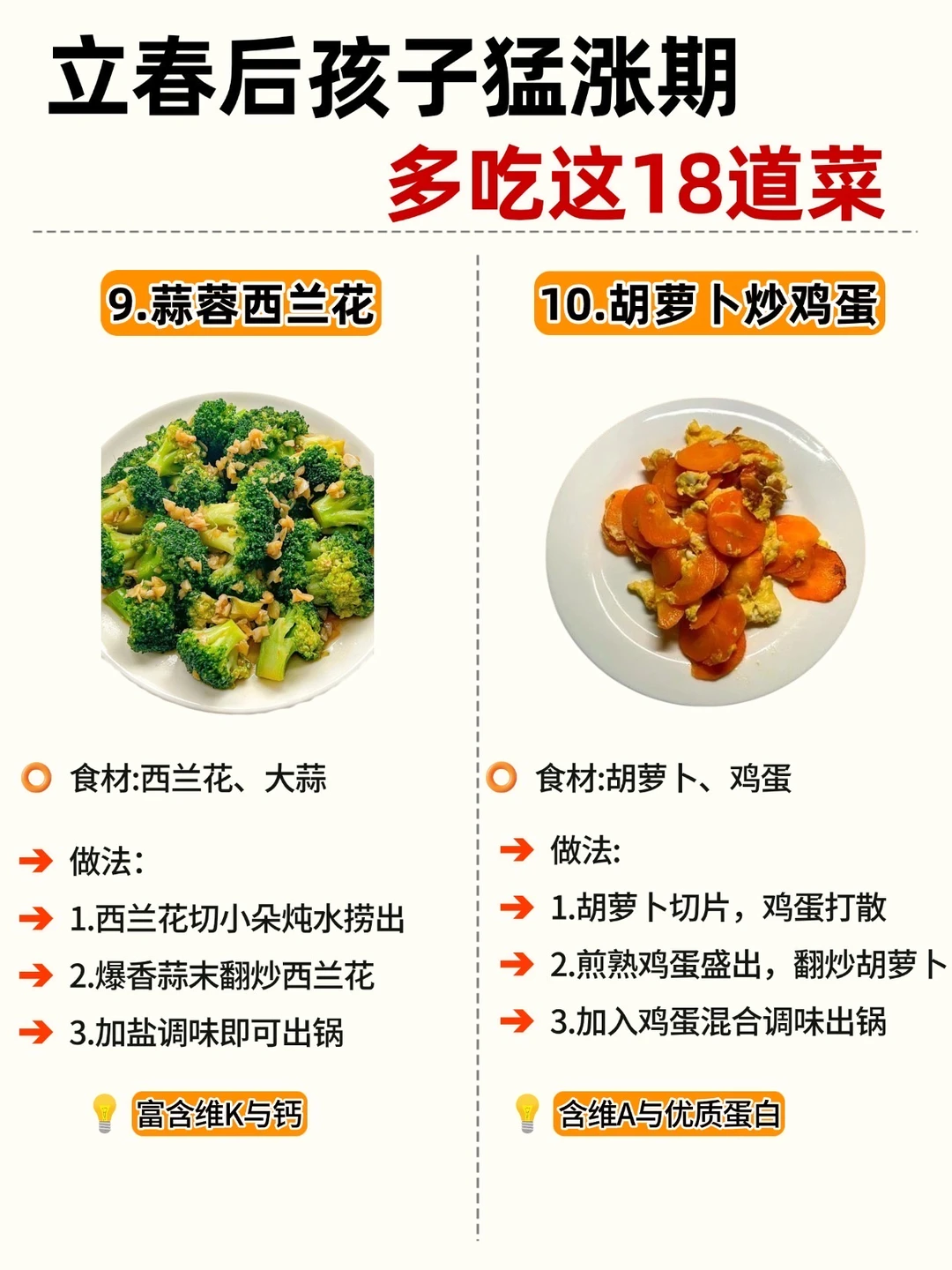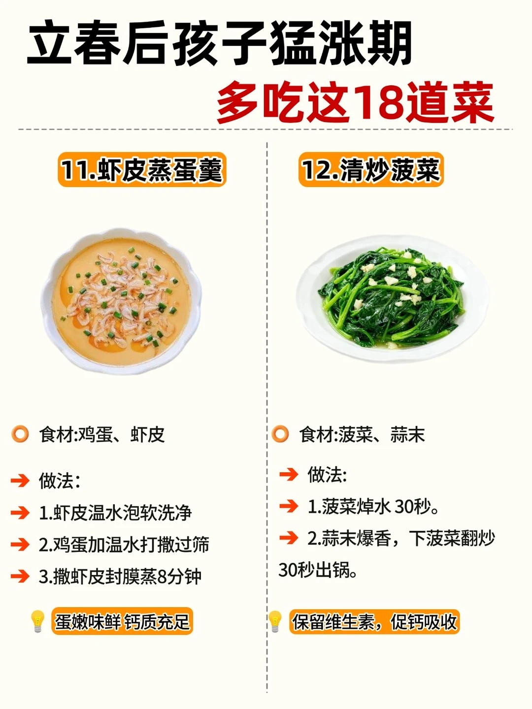 立春一到,万物复苏 娃的身高猛涨黄金期也来啦! 抓住 3-5 月黄金季,吃对饭比啥都强! 整理了 18 道家常长高菜补钙、补蛋白、促消化做法简单,每天不重样宝妈们直接抄作业 ✅Ps: V 每天保证30分钟户外晒太阳 V晚上9点前入睡,生长激素分泌旺 V 少喝饮料、少吃零食,脾胃好吸收才快