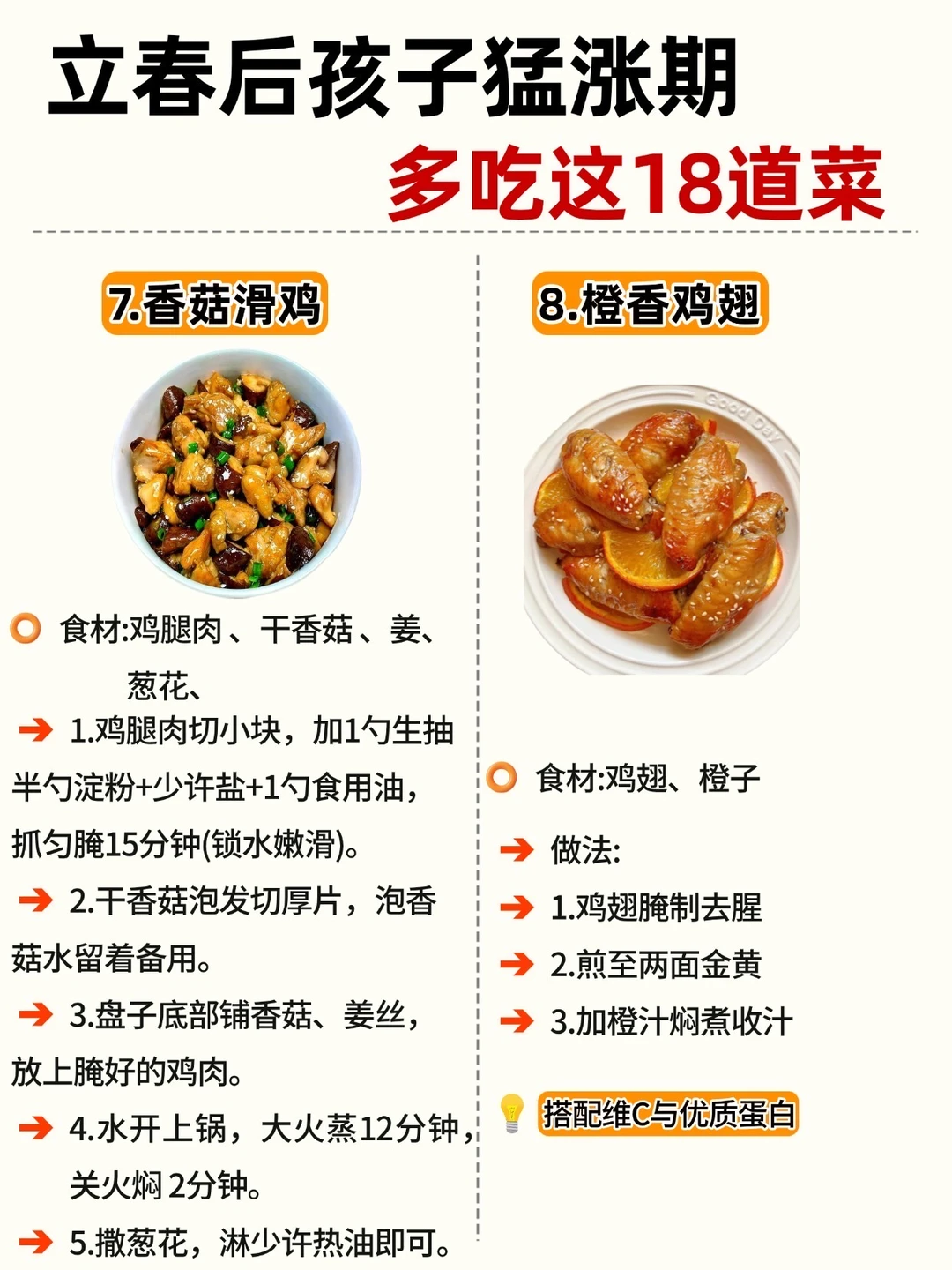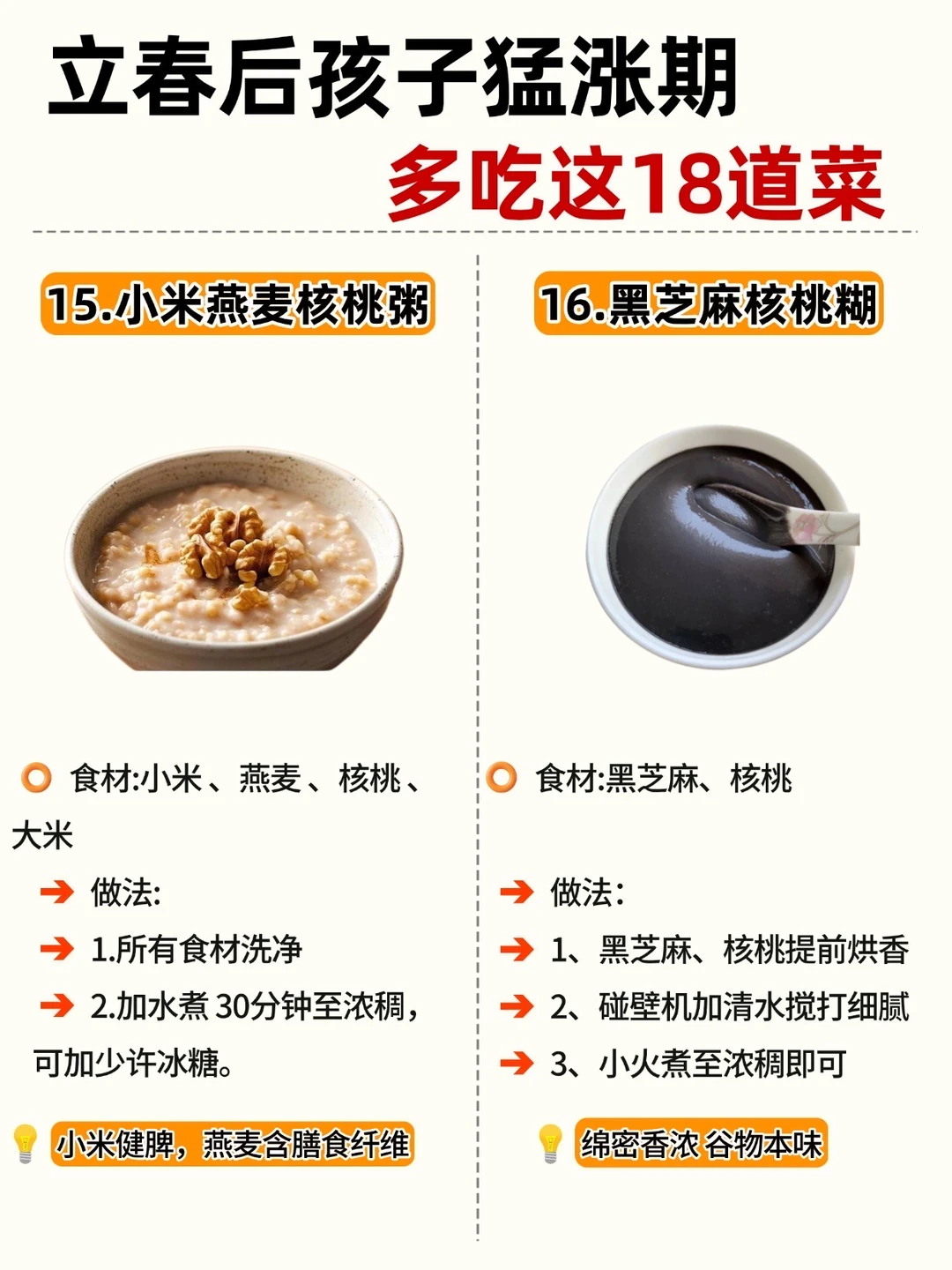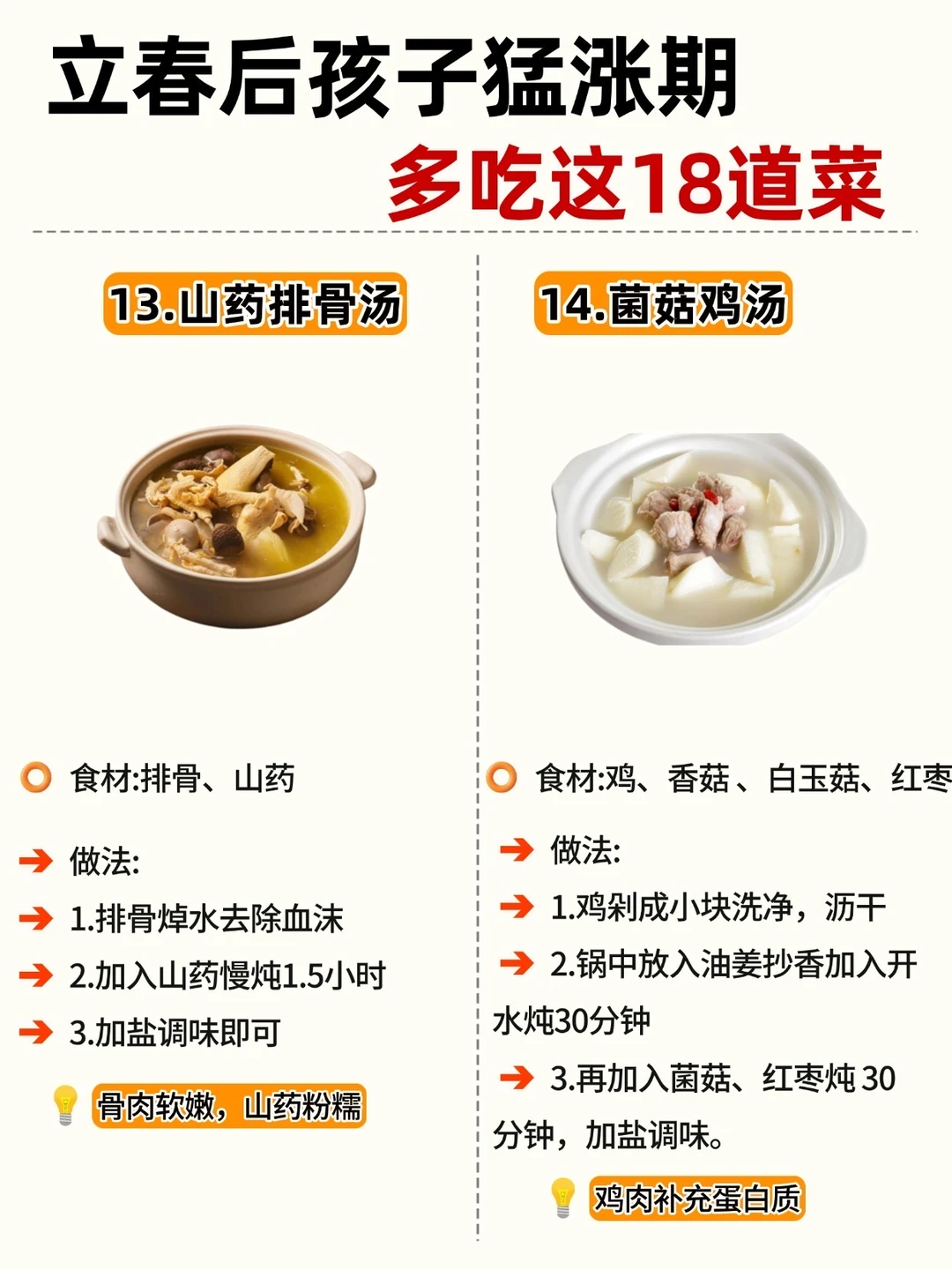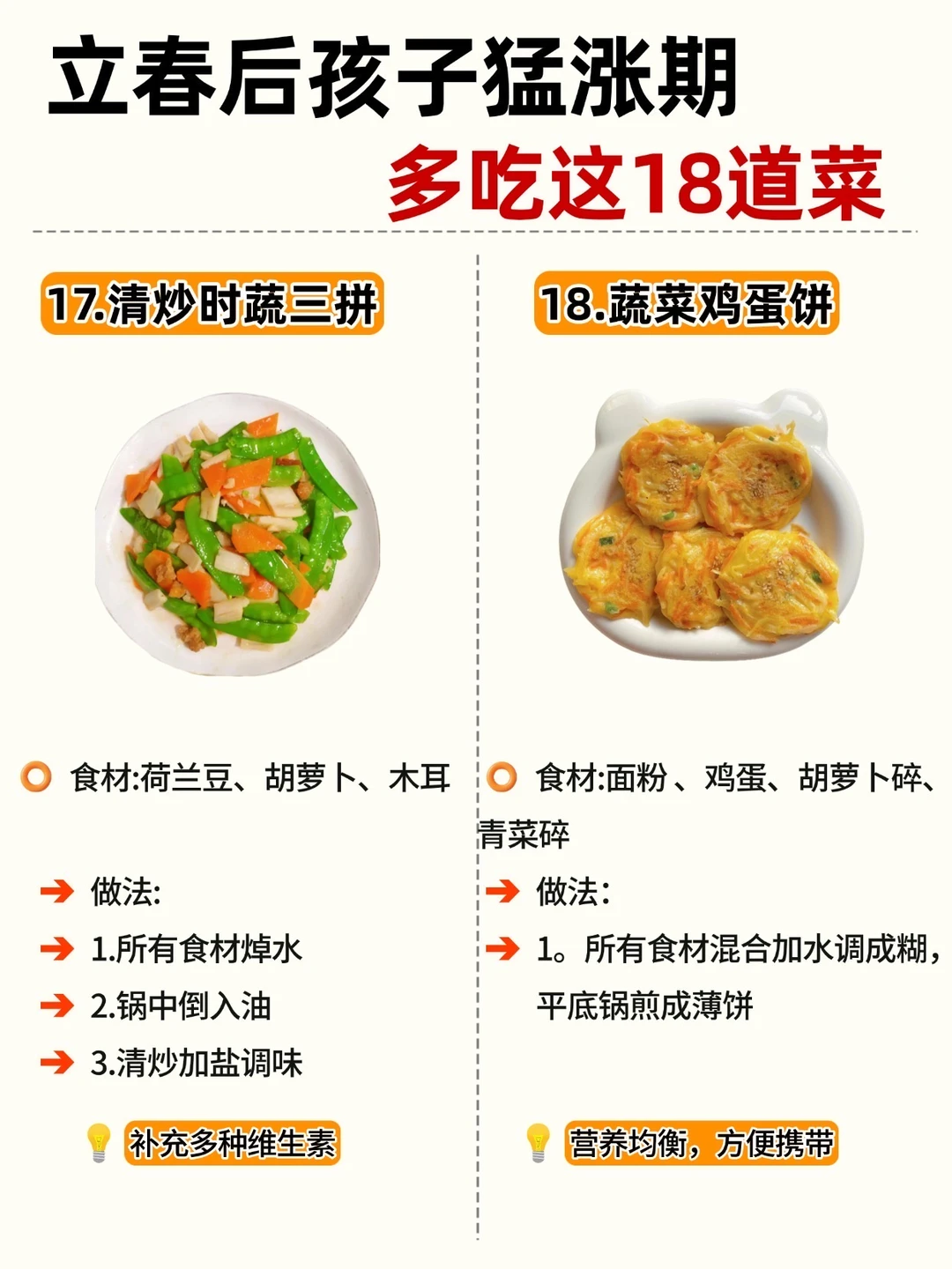 立春一到,万物复苏 娃的身高猛涨黄金期也来啦! 抓住 3-5 月黄金季,吃对饭比啥都强! 整理了 18 道家常长高菜补钙、补蛋白、促消化做法简单,每天不重样宝妈们直接抄作业 ✅Ps: V 每天保证30分钟户外晒太阳 V晚上9点前入睡,生长激素分泌旺 V 少喝饮料、少吃零食,脾胃好吸收才快