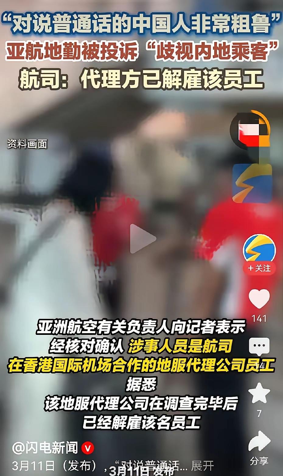 香港机场亚航地勤出言不逊,公然否认自己是中国人,直接被解雇! 香港回归二十余载,身为中国香港的服务人员,对着说普通话的同胞态度恶劣,还发表数典忘祖的言论,既丢了职业底线,更伤了民族情感。 这件事一经曝光,立刻在全网炸开了锅,无数网友拍手称快,大家愤怒的不只是一次糟糕的服务体验,而是有人在国门之下、同胞面前,公然撕裂身份、践踏底线。 香港从来都是中国不可分割的一部分,这是不容置疑的事实,也是刻在每一个中国人血脉里的认同。 机场本是城市的窗口,地勤代表的不只是一家公司,更是中国香港的形象。 穿着制服站在岗位上,就该明白自己的一言一行都代表着这片土地。 对同胞恶语相向,用语言区别对待,把职业素养抛在脑后,把家国认同踩在脚下,这样的人根本不配从事服务行业,更不配站在香港国际机场的岗位上。 有人说这只是个别员工的问题,可恰恰是这种个别行为,最能戳中大家的痛点。 回归二十多年,香港与内地血脉相连、经济相融、民心相通,越来越多的内地游客赴港出行,越来越多的香港同胞走进内地,本就是一家人,不该有隔阂,更不该有歧视。 一句“不是中国人”,寒的是亿万同胞的心,毁的是自己的前途。 官方处理果断干脆,直接解雇,就是给所有抱有错误思想、做出不当行为的人敲响警钟。 在国家主权和民族认同面前,没有任何商量余地。 服务可以有差异,态度可以有不同,但尊重不能分地域,认同不能分语言。 香港的繁荣稳定,离不开祖国的坚强后盾;香港市民的尊严与荣光,也离不开强大祖国的支撑。 任何数典忘祖、破坏团结的言行,都注定被大众唾弃,被市场淘汰,被时代抛弃。 出门在外,我们都是中国人;立足香港,我们更是中国人。 尊重同胞,守住底线,心怀家国,才是立足之本。 这样的处理大快人心,也希望所有服务人员引以为戒,别再触碰红线,别再伤害同胞感情。 对于这件事,大家有什么看法?欢迎在评论区留言讨论。