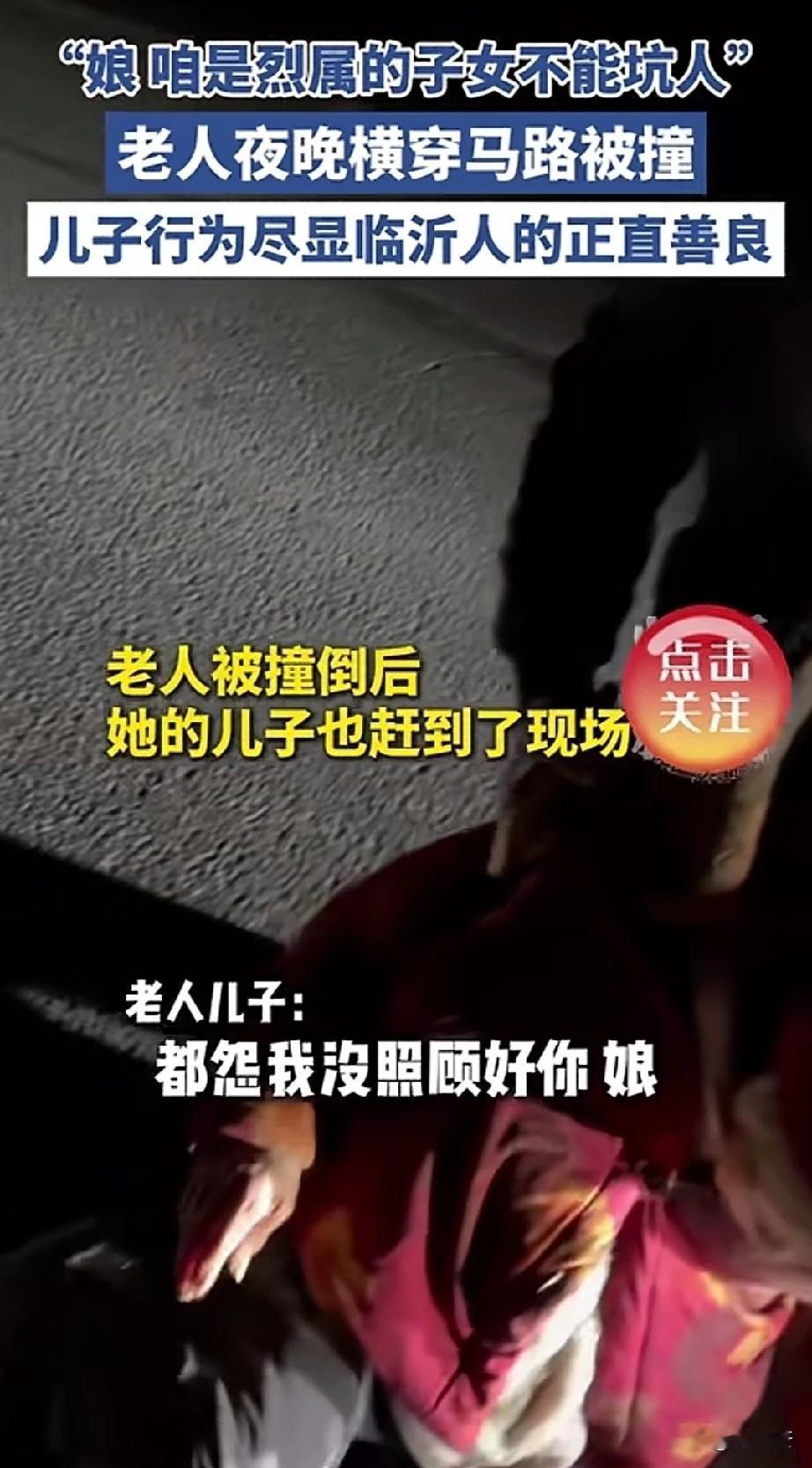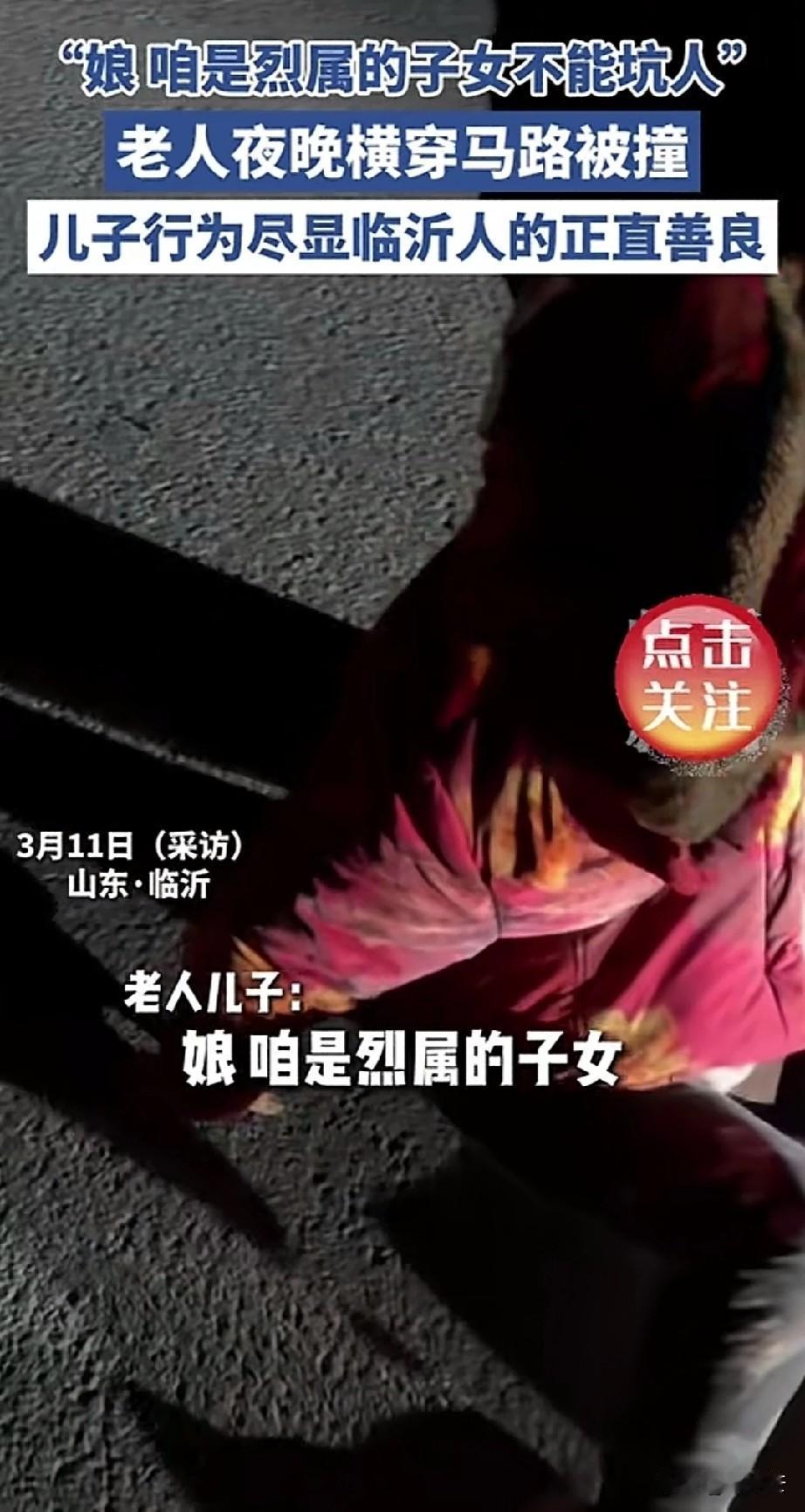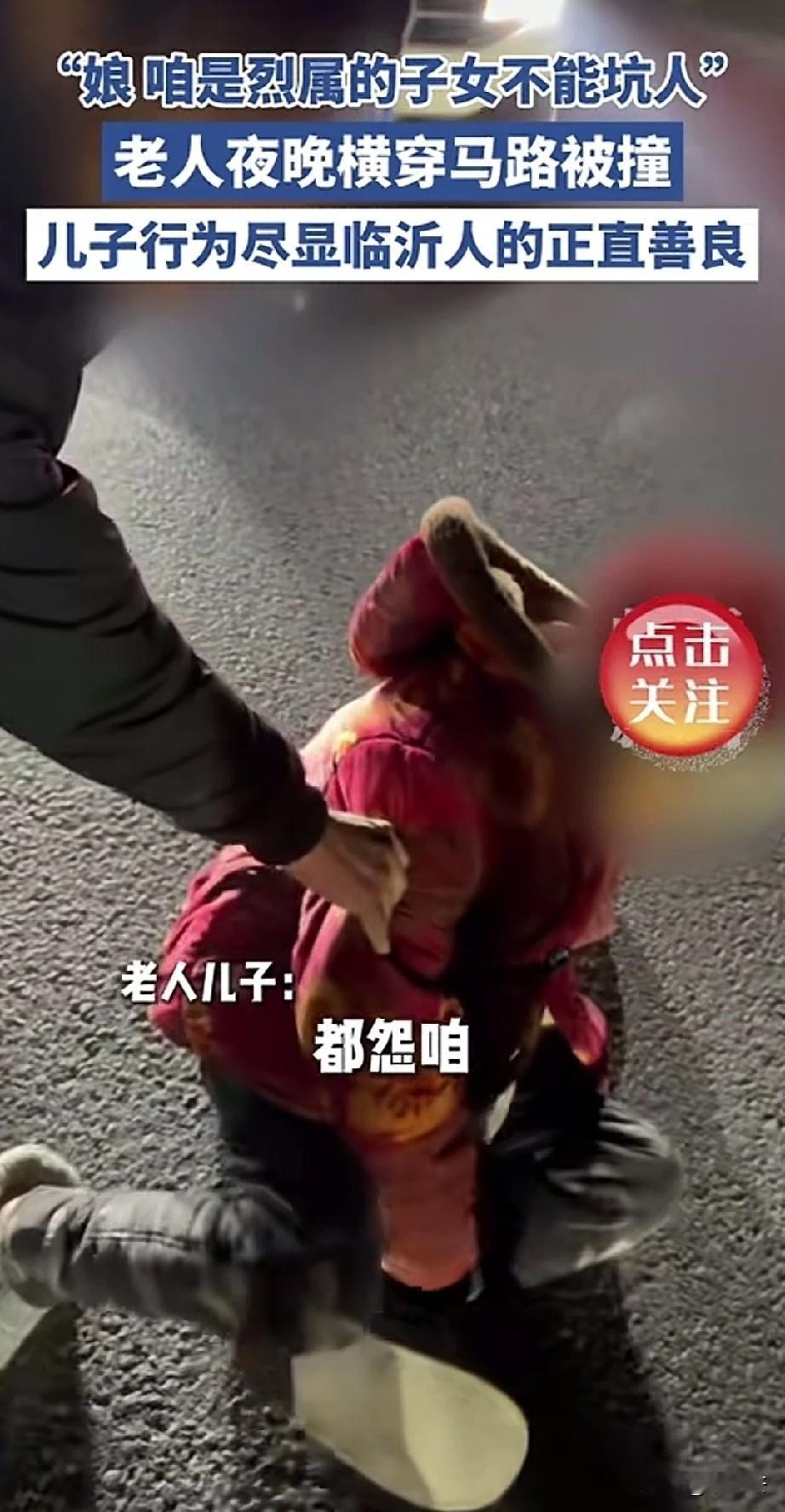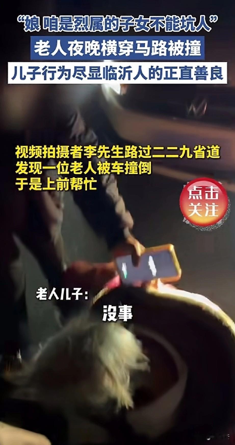 “为山东人点赞!”一网友发布正月十五偶遇车祸事故,一辆小轿车撞了一位老人,老人儿子得知后骑车赶来。肇事司机慌忙给老人儿子解释,我开的是近光灯,车速也不快,是正常行驶,老太太直接就到了前面玻璃上了,来不及躲避。老人儿子:不怪你,都怨俺娘,咱是烈士家属,不能坑人,不能耽误您事! 老人儿子来到现场后,第一时间看望老大娘的情况,一句没有责怪司机。一直责怪自己没有护送老母亲过马路,才导致被撞。 司机说自己车有全险,大娘有什么事都有保险公司可以保险。老人儿子说,有全险也不用你花钱,俺娘吃药都不用花钱的。 因为老人因为年龄大,被撞后无法动弹,腿擦伤了一点皮,随后被120送到医院检查。 一直到送到救护车上,家属还说不用司机去,不用管,别耽误别人事。 司机坚持要留下电话,有什么事好给打电话,热心网友也说,就因为是烈士家属,所以更不能让烈士家属受委屈,该怎么检查就该怎么检查。 网友说司机没有推脱责任,大娘没有故意讹人,美好遇见美好,人心很暖,山东人很棒,这才是烈士家属最该有的样子,为先烈增添了新的荣光。 有人说,没有人拿着烈属这个资格去炫耀,却有人拿着烈属的身份去规范自己的言行。一家人都是正直善良的好人。